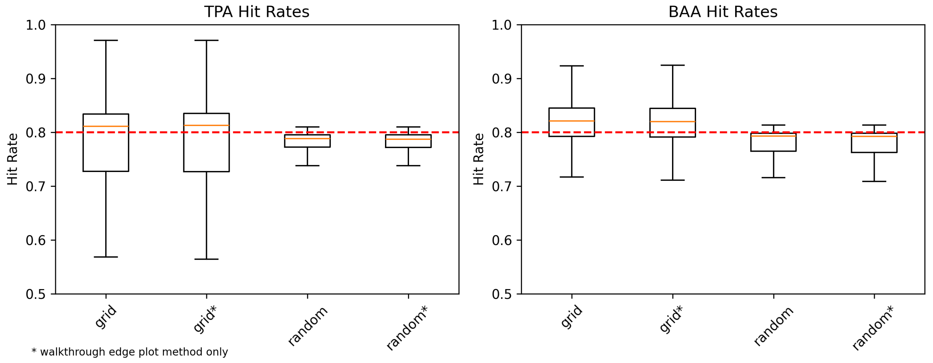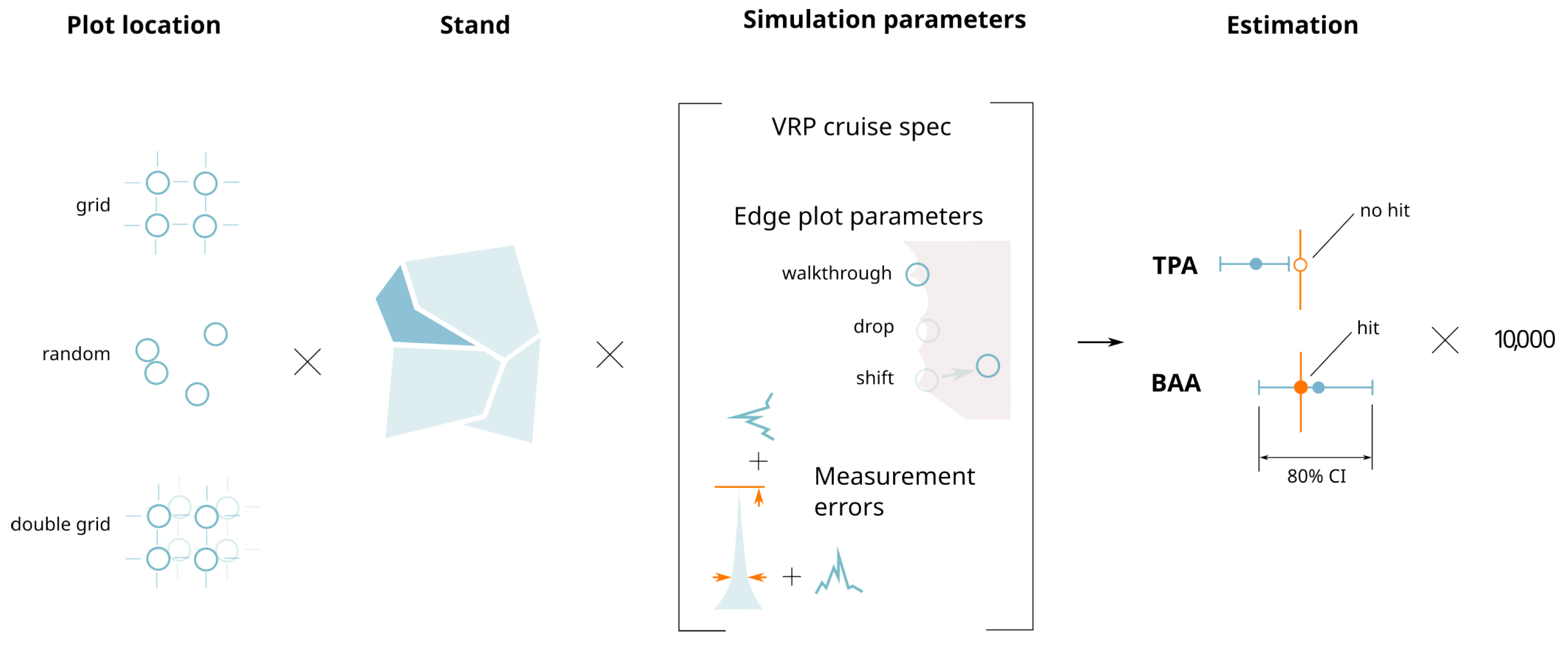 - Basal area factor (BAF) multiplier: To mimic a realistic cruise, the optimal BAF to achieve a tally of 10 trees per plot is estimated for each stand. To determine this optimal BAF, a single simulation is performed for each stand using the specification with the default BAF to establish a baseline tally. Then, a grid search is conducted over a range of possible BAF values, running simulations for each candidate value to estimate the average number of tallied trees per plot. After that, a multiplier is applied to the optimal BAF to approximate a cruiser systematically using a larger or smaller BAF.