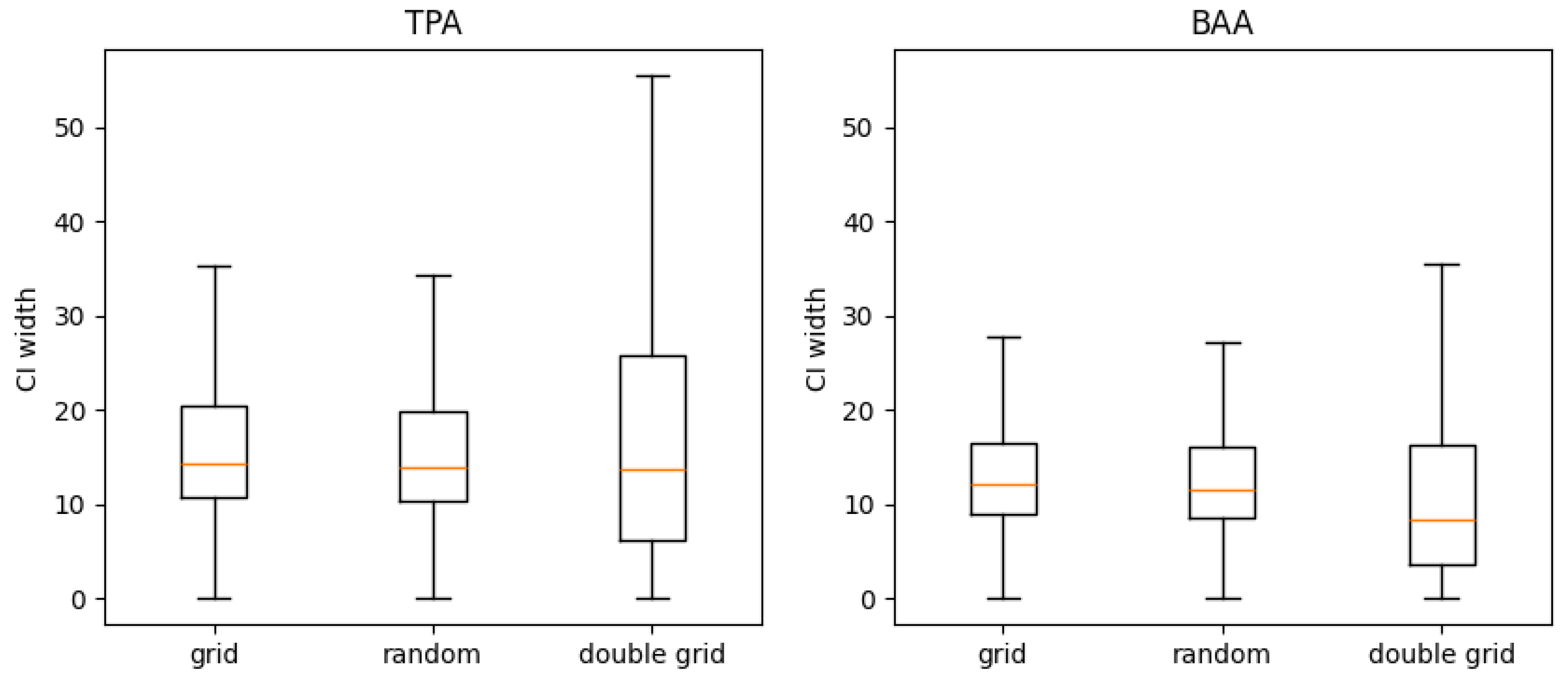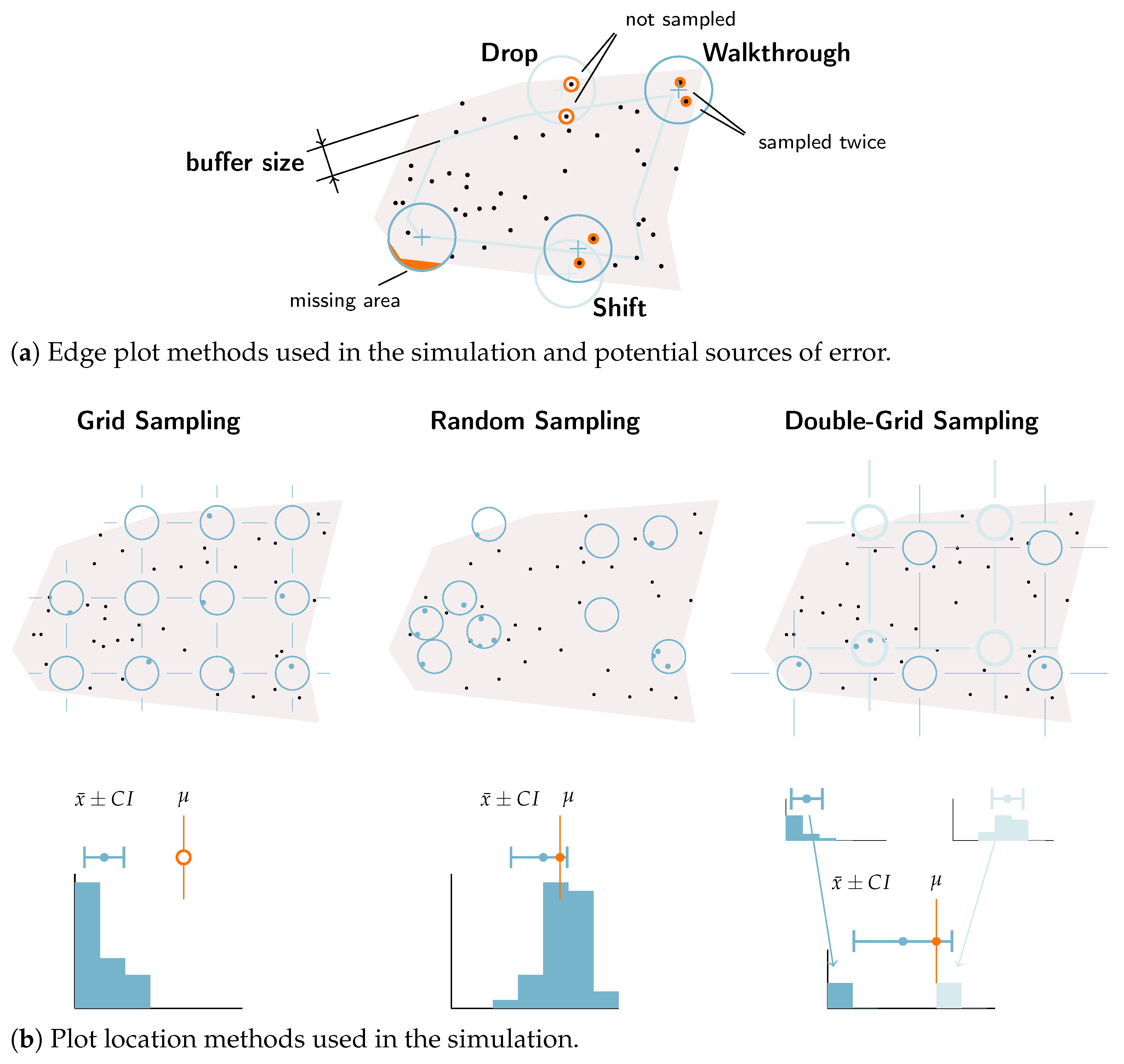 - Double grid: Each stand is overlaid with two grids, with the origin point of each grid selected at random, as described by Freese 1962 [9], which results in two independent estimations for a single stand. Since the two estimations are derived randomly and independently, they can be treated as truly random values. The final estimate and its confidence interval are then calculated based on these two values.