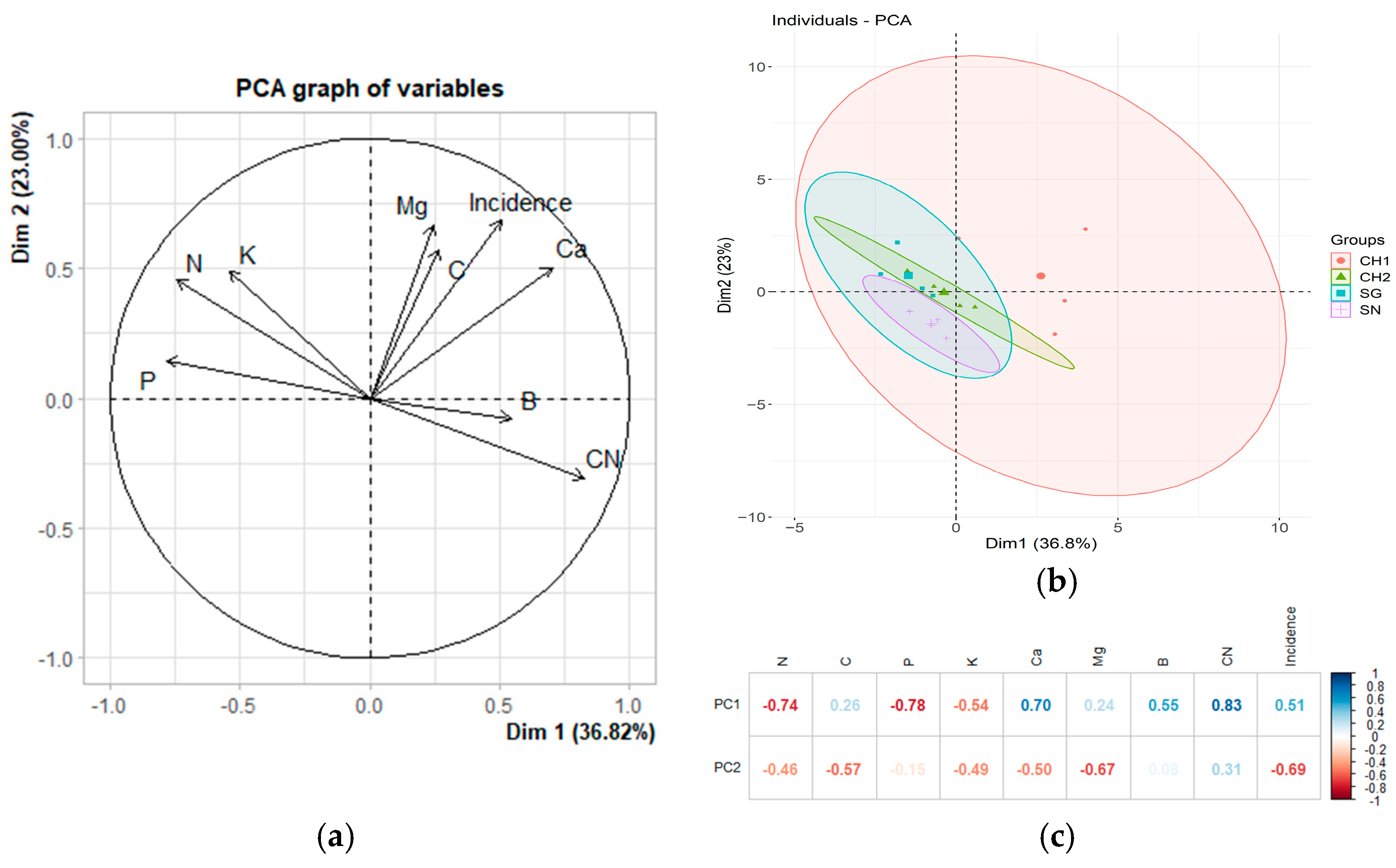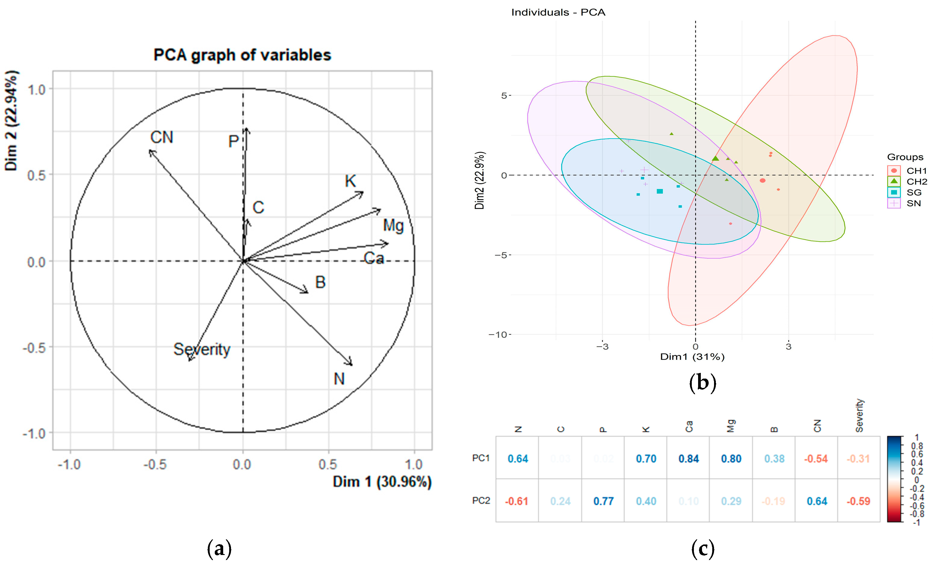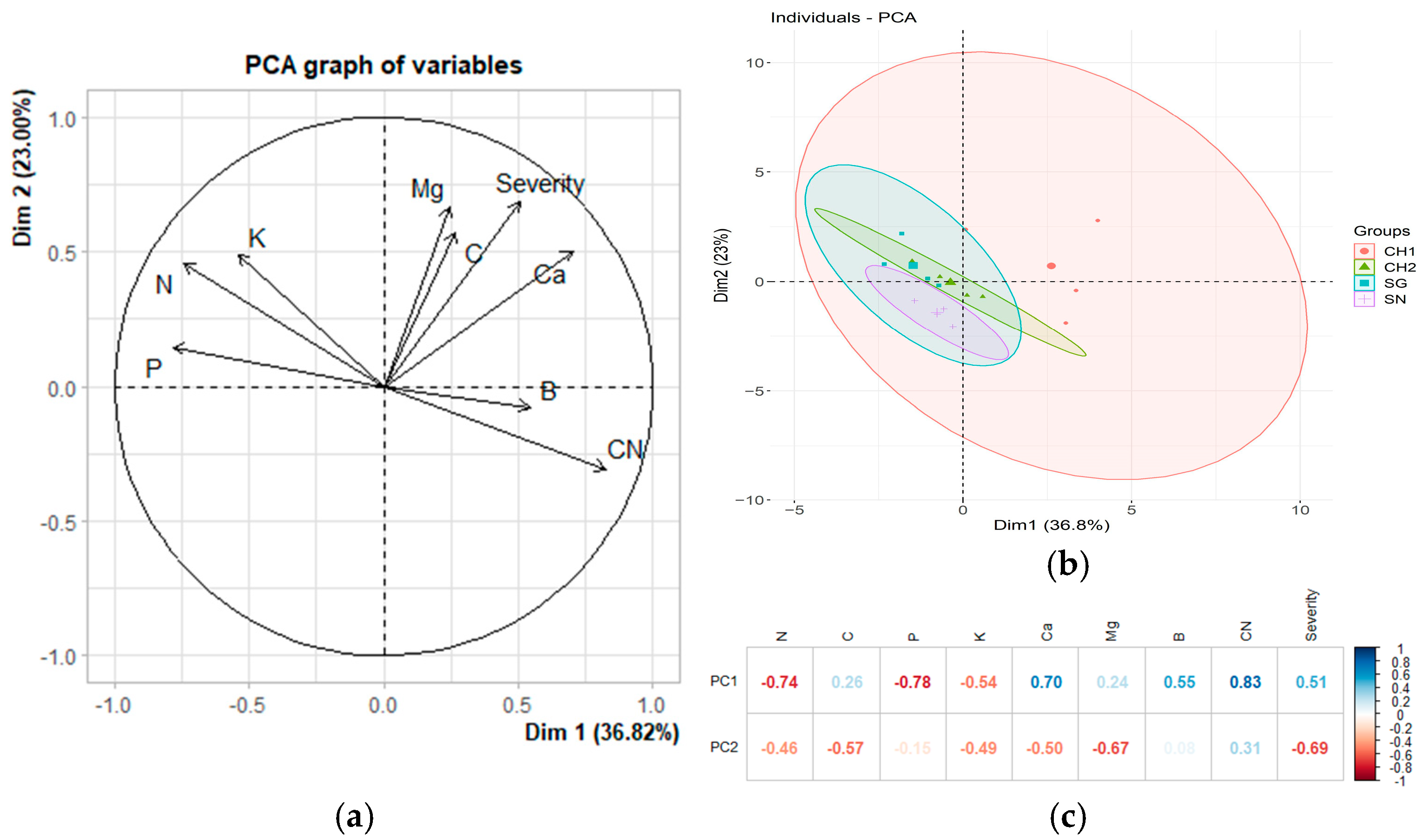 Table A1), with significant differences observed when compared to the CH1. Clonal hybrids are generally known to encounter challenges in root development, which can impair nutrient uptake, particularly for phosphorus, due to its low mobility in the soil [