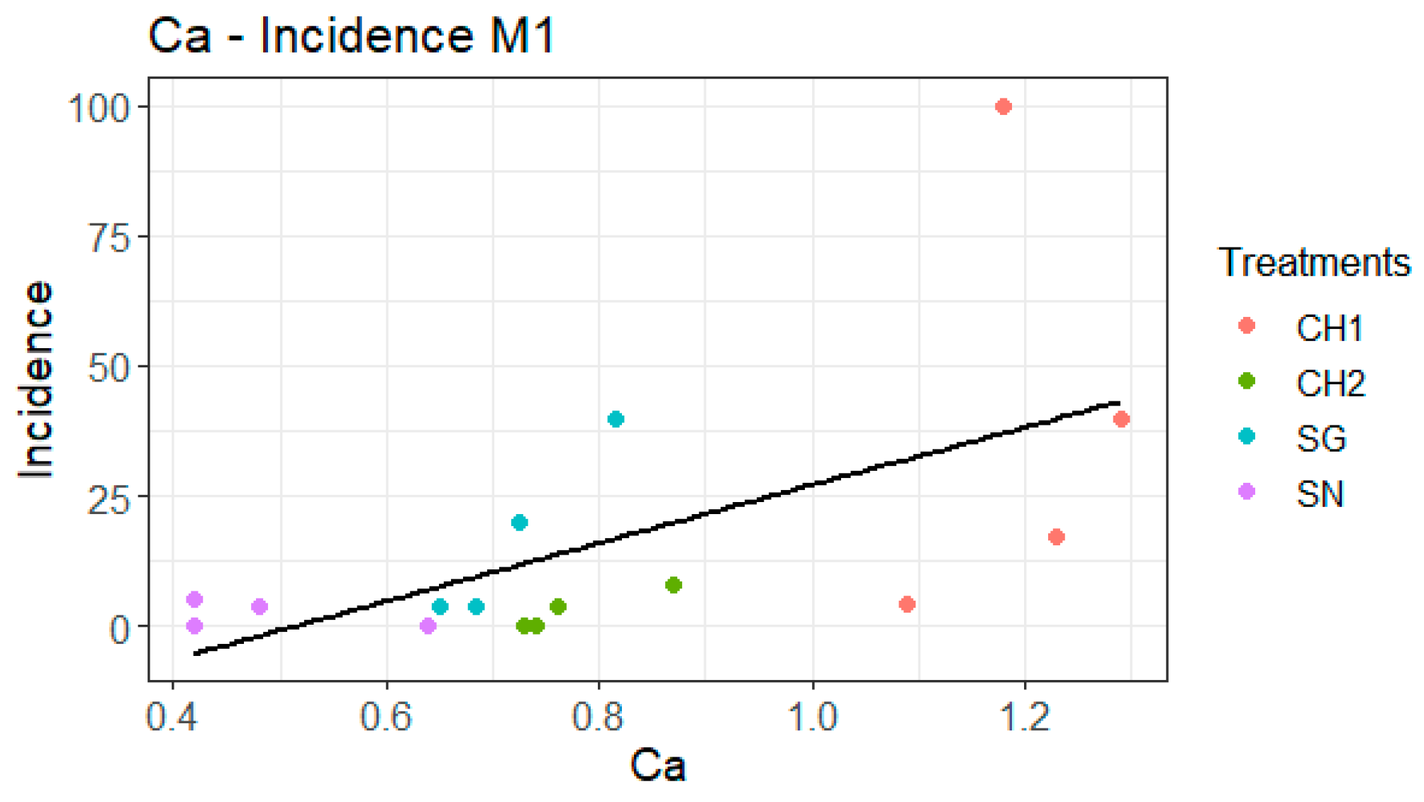 When examining the incidence in M1, no statistically significant differences were found, possibly due to the high variability registered. Nevertheless, the trends observed in M2, where the SG treatment demonstrates a much higher defoliation than the other treatments, are consistent with the literature and our expectations regarding the resistance of hybrids.