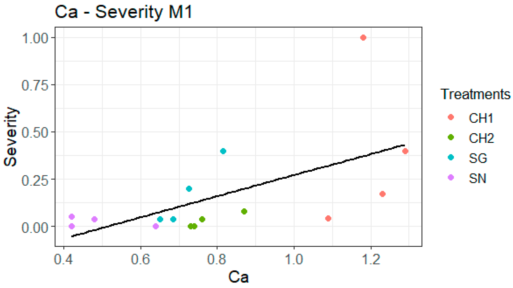 Regarding the hybrids, it was observed that the severity values of CH1 and CH2 were intermediate between those of