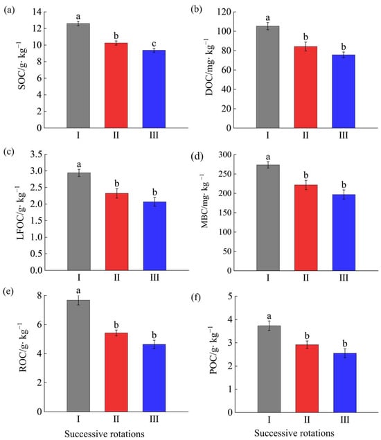 Content of soil organic carbon and its labile fractions of Eucalyptus grandis plantations of different successive rotations. Subfigures (a–f) present the contents of SOC, DOC, LFOC, MBC, ROC, and POC in different generations, respectively. Different lowercase letters indicate significant differences (p < 0.05). SOC: soil organic carbon; DOC: dissolved organic carbon; LFOC: light fraction organic carbon; MBC: microbial biomass carbon; ROC: readily oxidizable organic carbon; POC: particulate organic carbon. I: The first generation plantations. II: The second generation plantations. III: The third generation plantations. The same below.