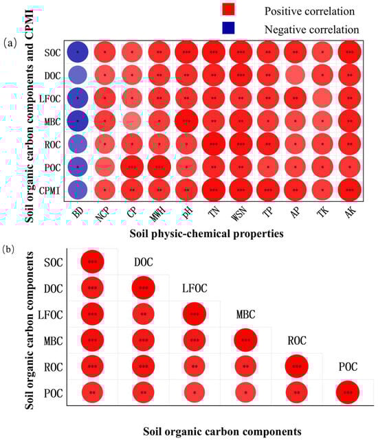 Correlation analysis among variables. Subfigure (a) illustrates the correlations between soil organic carbon fractions and soil physicochemical properties, while Subfigure (b) illustrates the correlations among the soil organic carbon fractions. The darker the color in the figure indicates a stronger correlation. * indicated significant correlation at p < 0.05; ** indicated highly significant correlation at p < 0.01; *** indicated very highly significant correlation at p < 0.001. BD: bulk density; NCP: non-capillary (air-filled) porosity; CP: capillary porosity; MWH: maximum water-holding capacity; pH: soil pH; TN: total nitrogen; WSN: water-soluble nitrogen; TP: total phosphorus; AP: available phosphorus; TK: total potassium; AK: available potassium; CPMI: carbon pool management index. The same below.