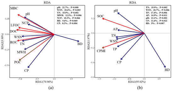Redundancy analysis (RDA) of soil organic carbon and active carbon components and soil factors in E. grandis plantations of different successive generations. Subfigure (a) presents the results of the RDA between soil active carbon components and soil physicochemical properties, while Subfigure (b) presents the RDA results for soil organic carbon, the carbon pool management index, and soil physicochemical properties.