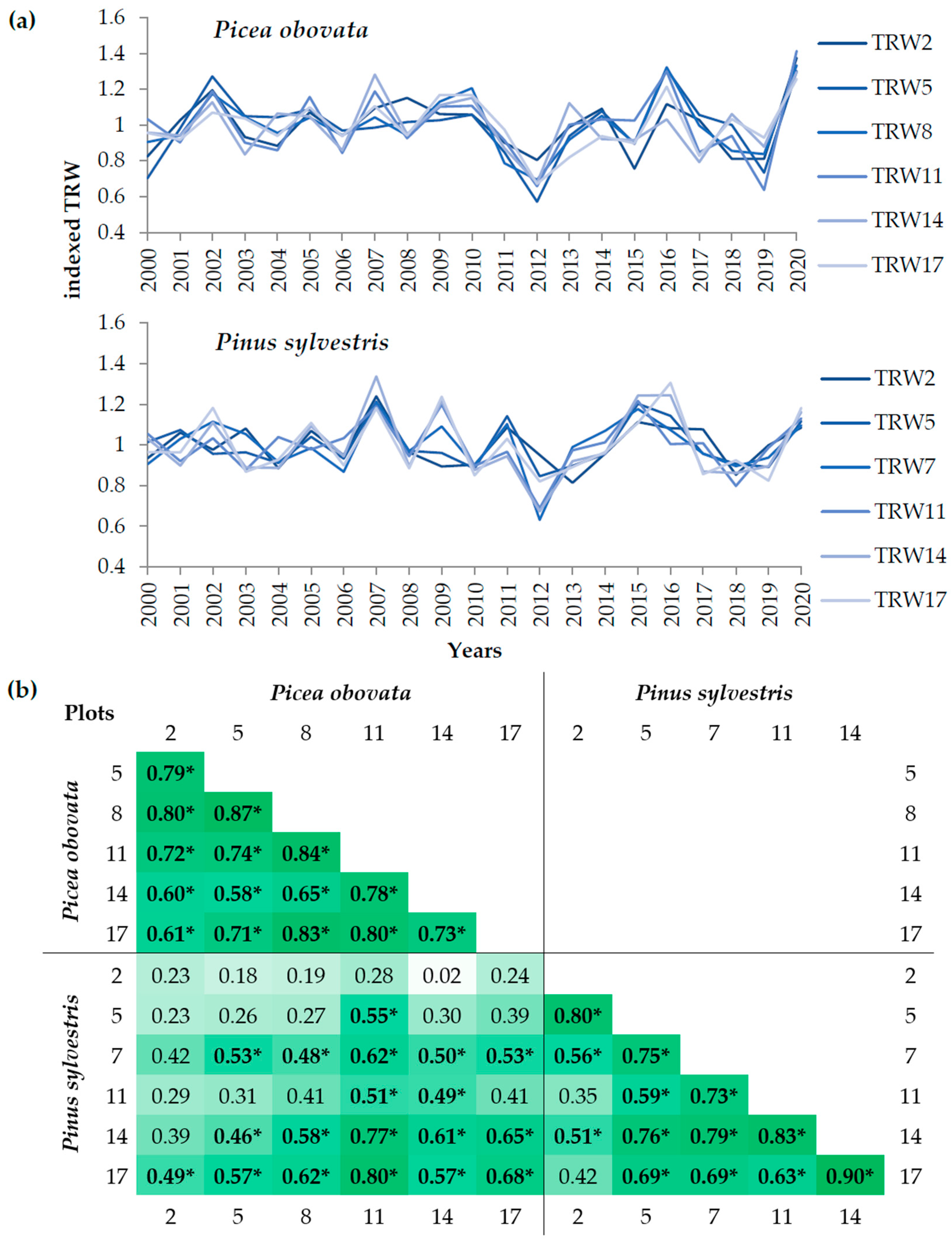 | TRW | Dmax | −0.18 | 0.17 | 0.66 * | 0.70 * | 0.59 * | 0.81 * | 0.74 * | 0.69 * | 0.37 | 0.38 | 0.57 * | 0.70 * | 0.75 * | 0.64 * |
