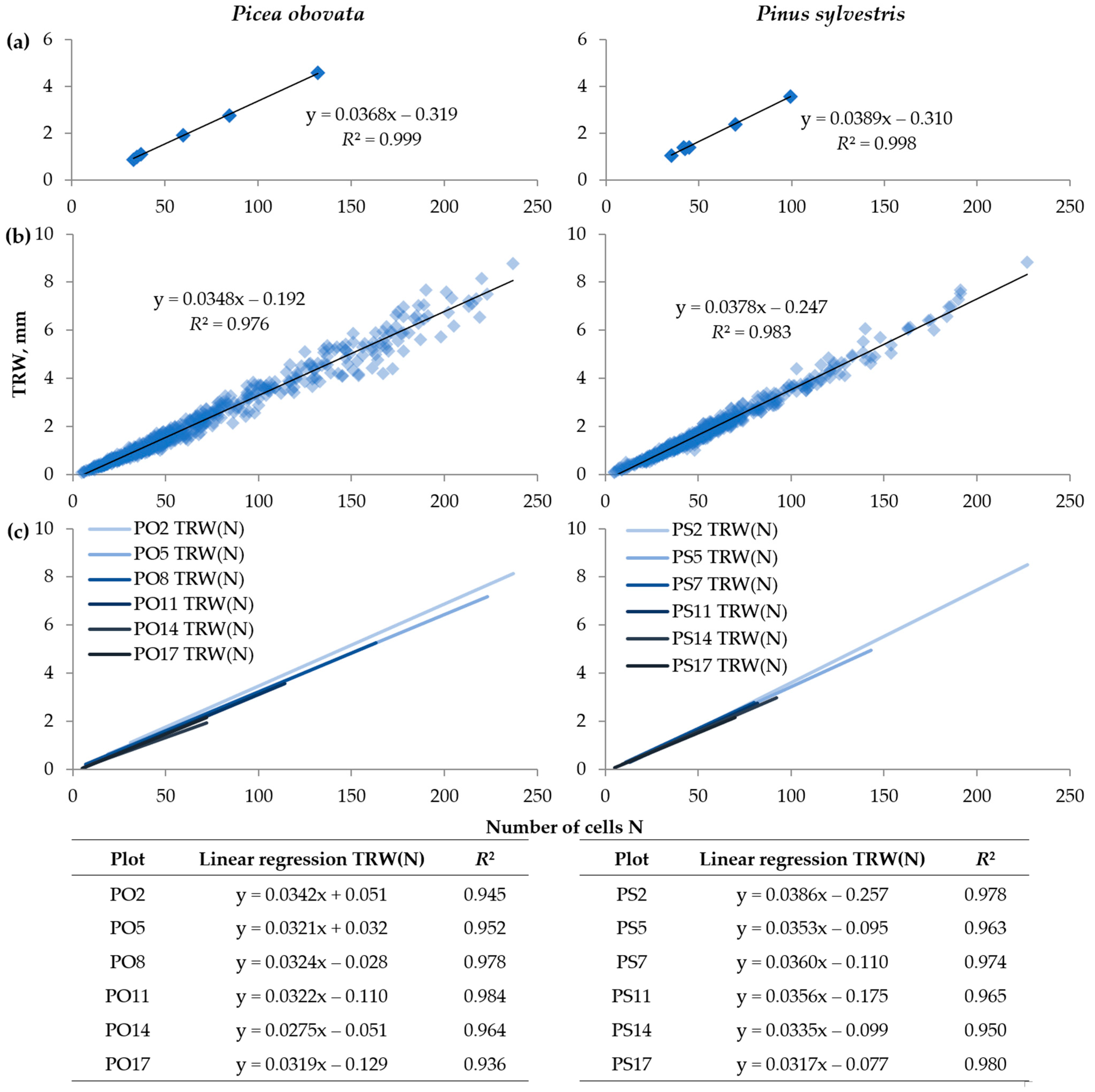 - Belokopytova, L.V.; Zhirnova, D.F.; Mehrotra, N.; Shah, S.K.; Babushkina, E.A.; Vaganov, E.A. Improving the equation of nonlinear relationships between cell anatomical parameters of conifer wood. Trees 2024, 38, 1593–1599. [Google Scholar] [CrossRef]