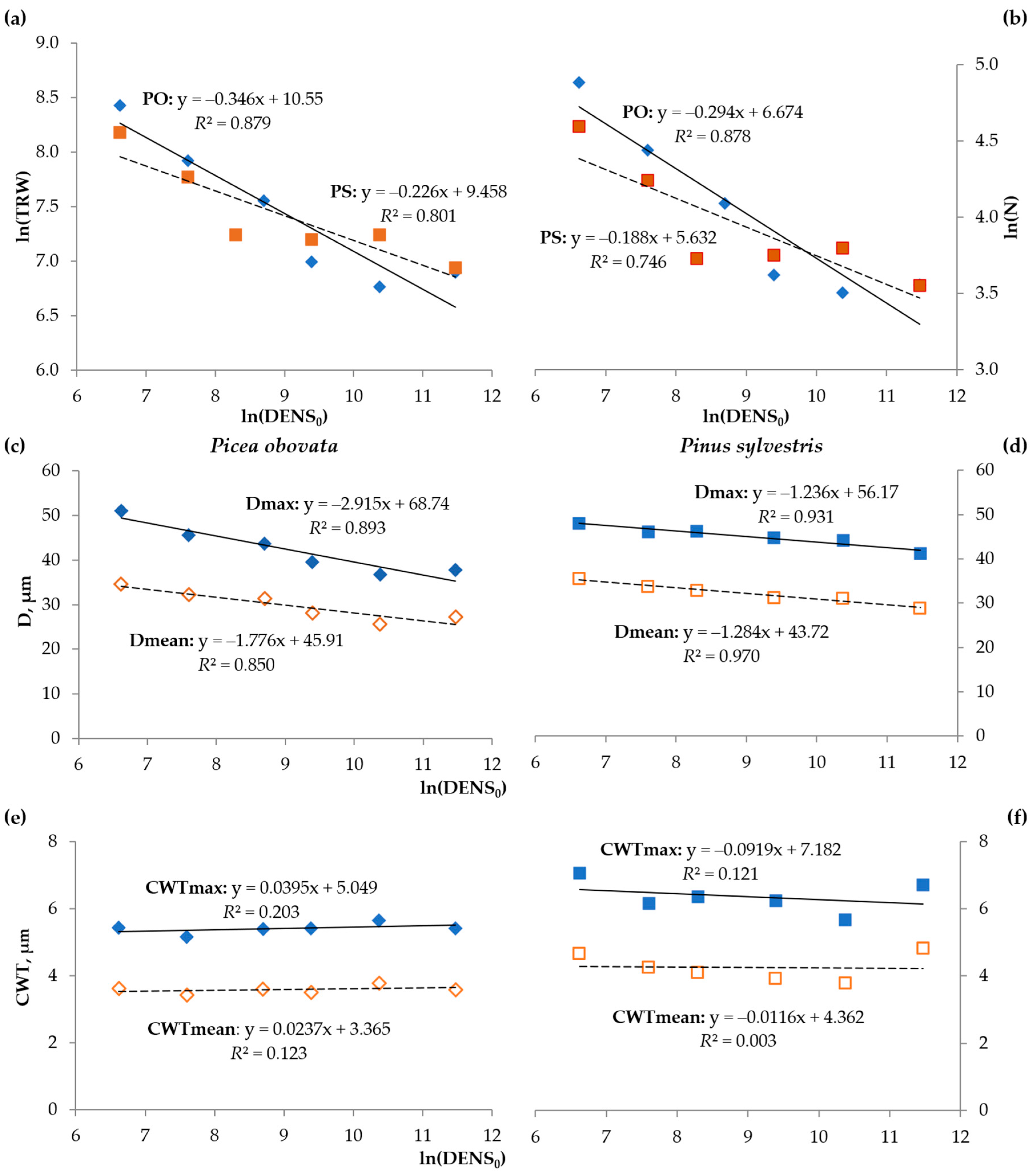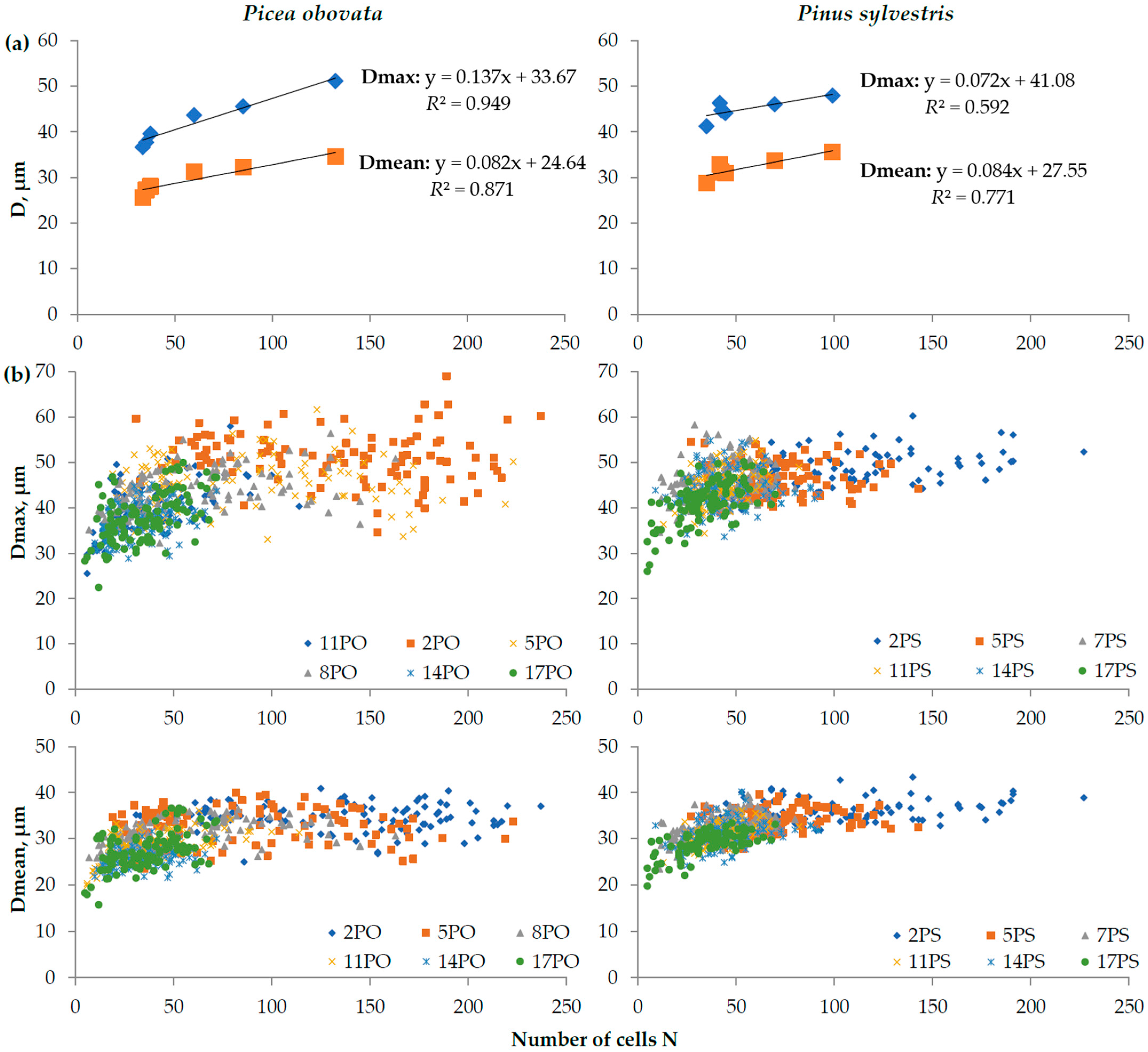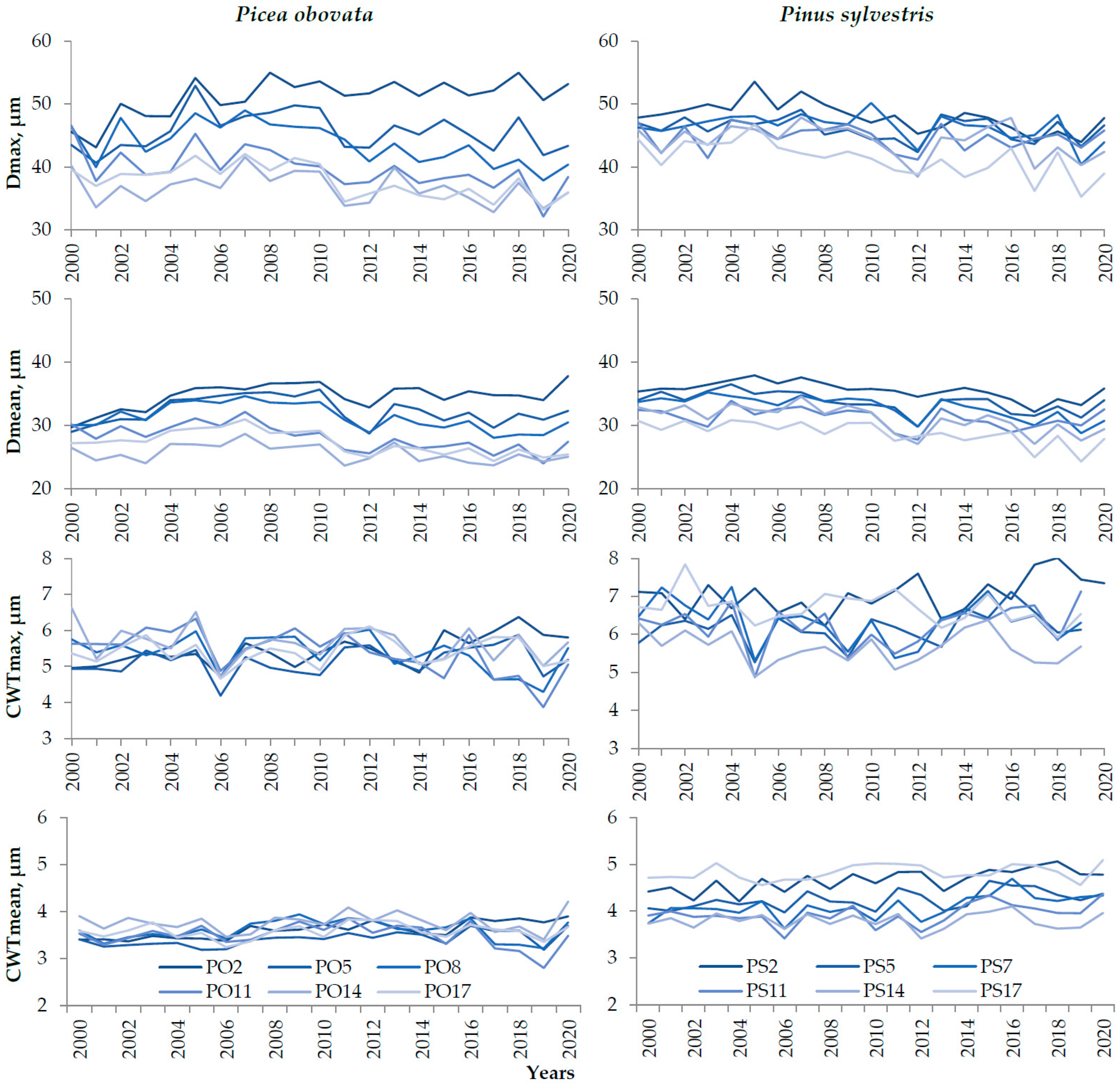 | Species | Plots | N | Dmean, μm | Dmax, μm | CWTmean, μm | CWTmax, μm | Dmax2, μm2 | ρmax, kg/m3 |