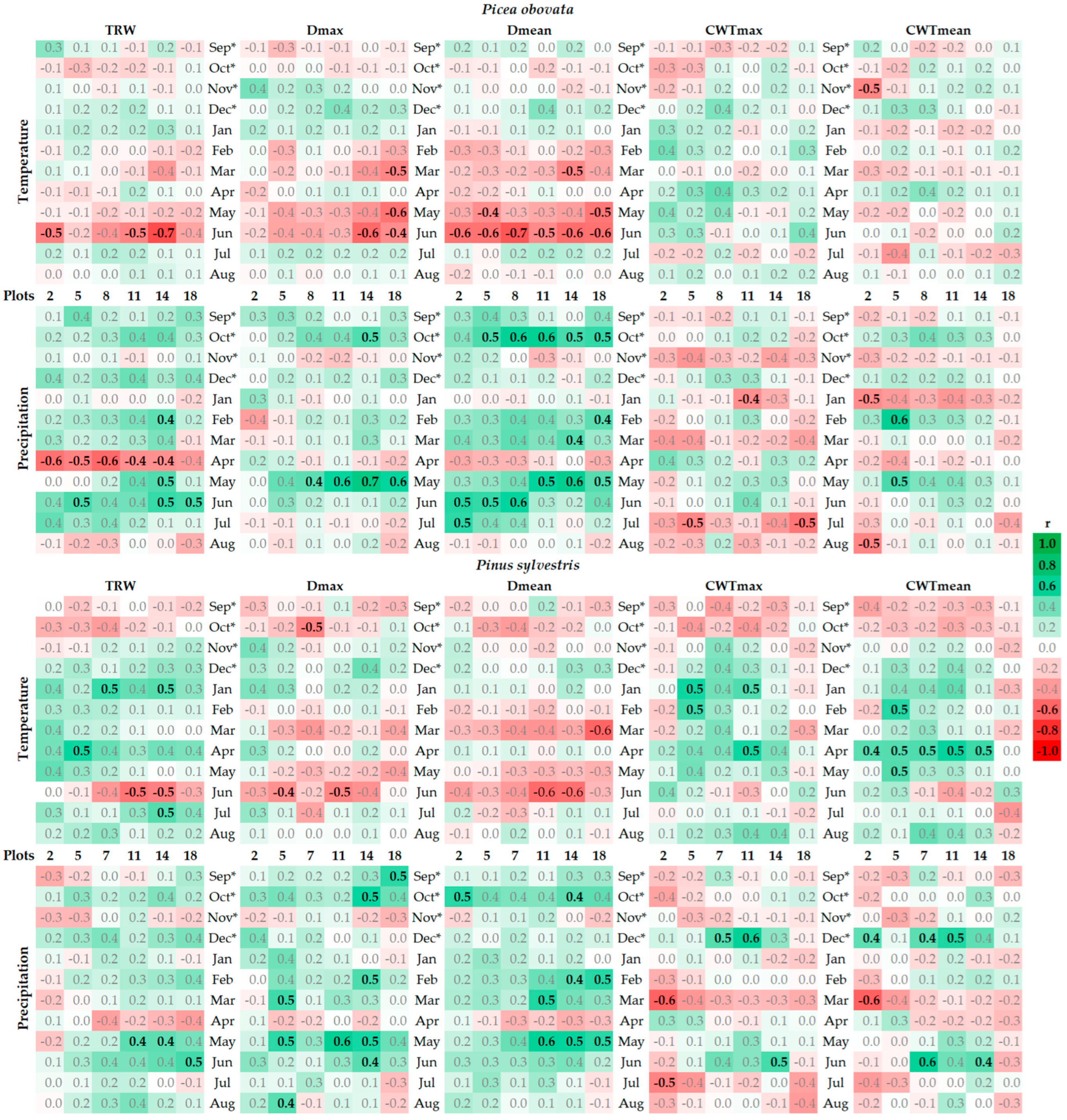 | Picea obovata | TRW | −0.18 | 0.00 | −0.03 | −0.39 | −0.39 | −0.03 | −0.21 |