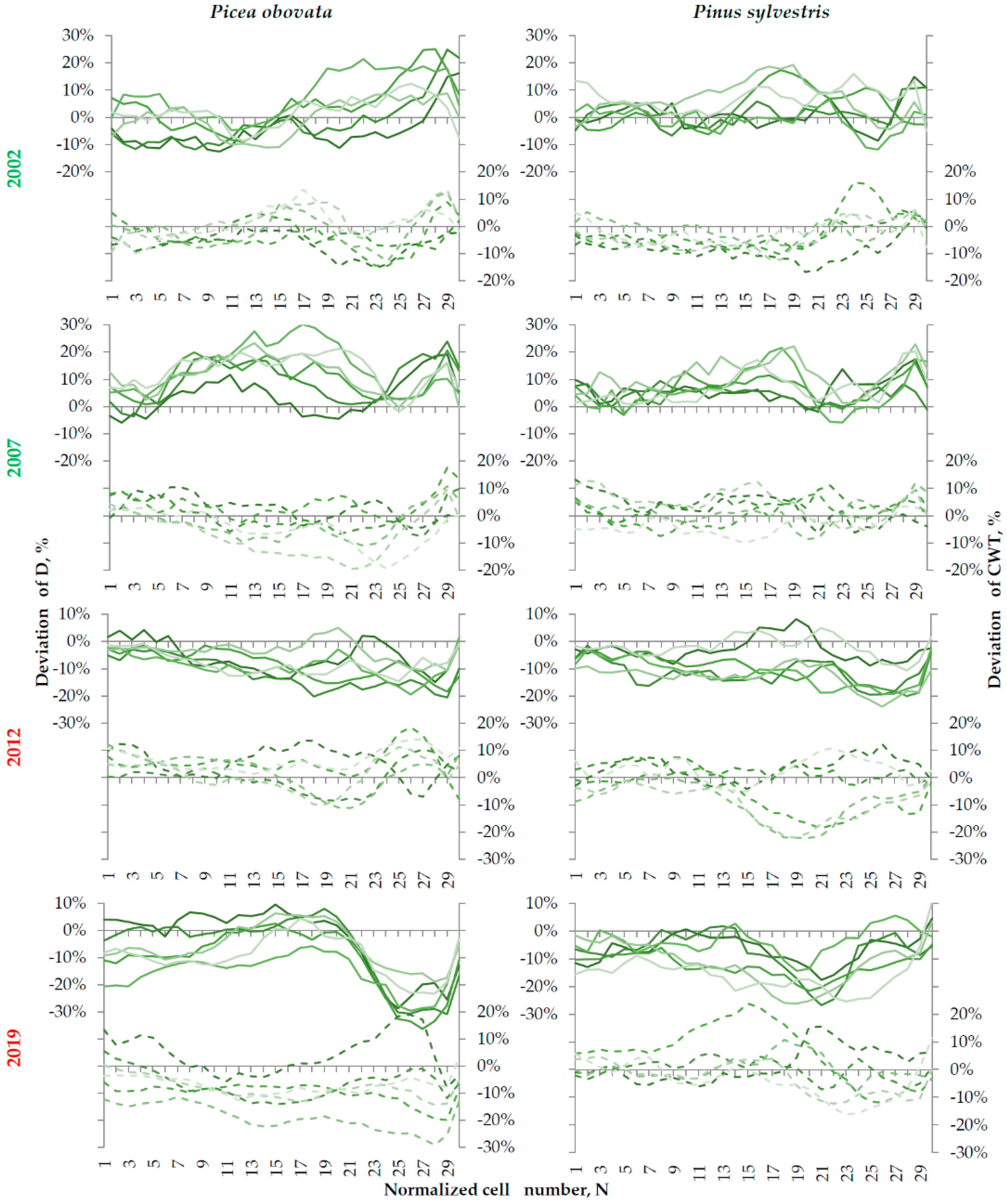 - Cabon, A.; Fernández-de-Uña, L.; Gea-Izquierdo, G.; Meinzer, F.C.; Woodruff, D.R.; Martínez-Vilalta, J.; De Cáceres, M. Water potential control of turgor-driven tracheid enlargement in Scots pine at its xeric distribution edge. New Phytol. 2020, 225, 209–221. [Google Scholar] [CrossRef]