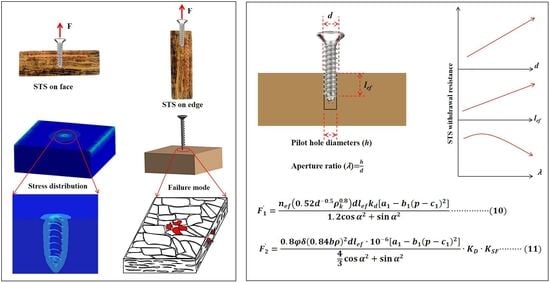 Compared with WOSB, BOSB is a new type of engineering material characterized by high strength and adequate dimensional stability [4,18,19,20]. Previous studies on BOSB have primarily focused on optimizing mechanical properties, with limited exploration of screw-holding performance. Zhang et al. examined the compressive and tensile properties of L-shaped components fastened with screws, taking into account variables such as screw installation spacing and connection type [2,6]. Xu et al. developed two varieties of plug-in connectors specifically adapted to the properties of BOSB materials and evaluated them against six conventional connector kinds. Their findings demonstrate that connector performance substantially affects connection strength, implying that various boards are appropriate for distinct connectors [21]. Moreover, Guo et al. determined that screw diameter, pilot hole diameter, and installation position significantly influence the withdrawal resistance of BOSB, observing that withdrawal resistance in all directions is markedly superior to that of traditional wood particle board [8]. However, there is a gap in understanding the influence of the installation aperture ratio on the withdrawal resistance of the STSs in BOSB, and the calculation of withdrawal resistance has not been thoroughly examined. The formulation of a theoretical model is essential for the practical application of these materials in engineering contexts. Multiple researches have assessed the withdrawal performance of STS and presented theoretical models to forecast withdrawal resistance [22,23,24]. Pang et al. conducted tests on STS withdrawal resistance in hybrid cross-laminated timber composed of solid wood and plywood [25], proposing a theoretical model based on the shear mechanism. The discrepancy between predicted and experimental results ranged from 86% to 88%. Kim analyzed the withdrawal resistance of layers made from Japanese larch and yellow poplar, considering variables such as nail layer type, adhesive type, and screw direction, and introducing a formula to predict withdrawal resistance [26]. Li et al. investigated the withdrawal resistance of bamboo scrimber and established a formula for estimating the withdrawal resistance of STS in bamboo scrimber [9].