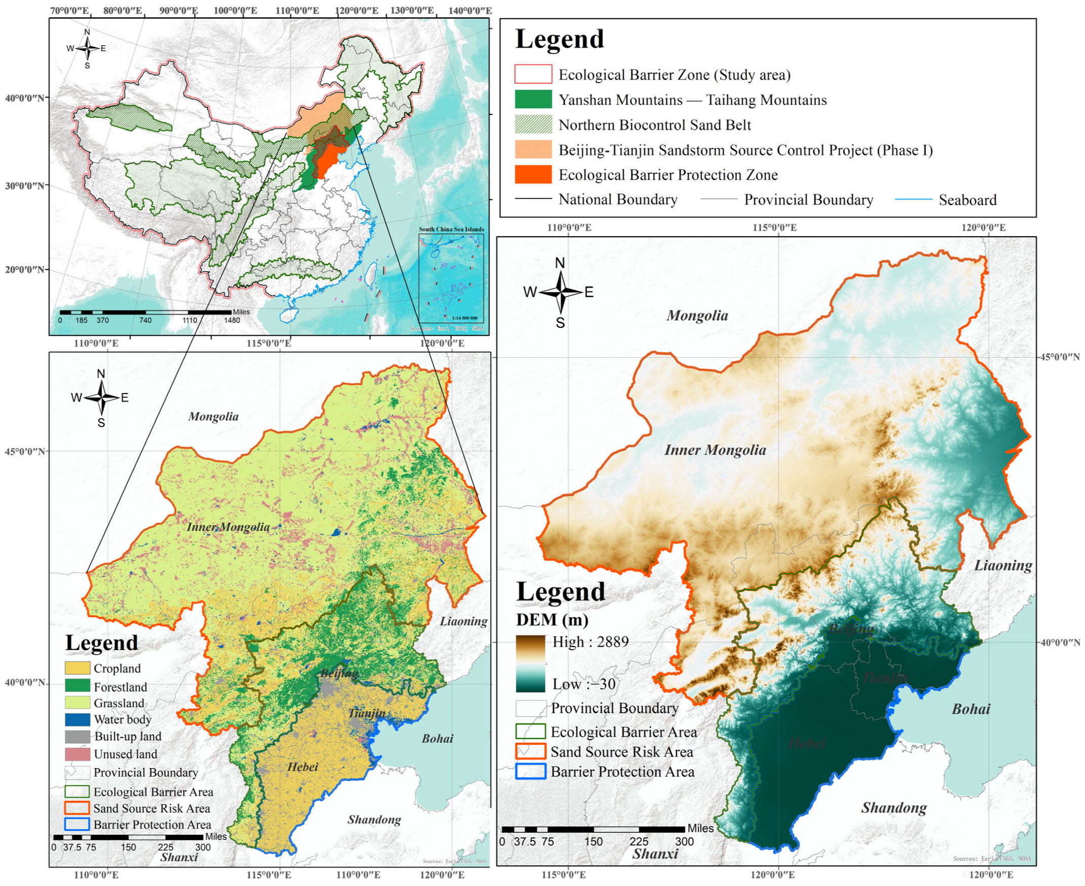 The Yanshan–Taihang Mountains Ecological Barrier Zone in the Beijing–Tianjin–Hebei region serves as a critical ecological security barrier in Northern China [34]. Primarily situated in Western and Northeastern Hebei Province, it encompasses a total area of 109,500 square kilometers. This region features rich forest, wetland, and mountain ecosystems, providing a strong ecological foundation and supporting diverse biological resources [35]. It fulfills essential ecological functions, including windbreak and sand fixation, soil and water conservation, water retention, and climate regulation [36] (Figure 2).