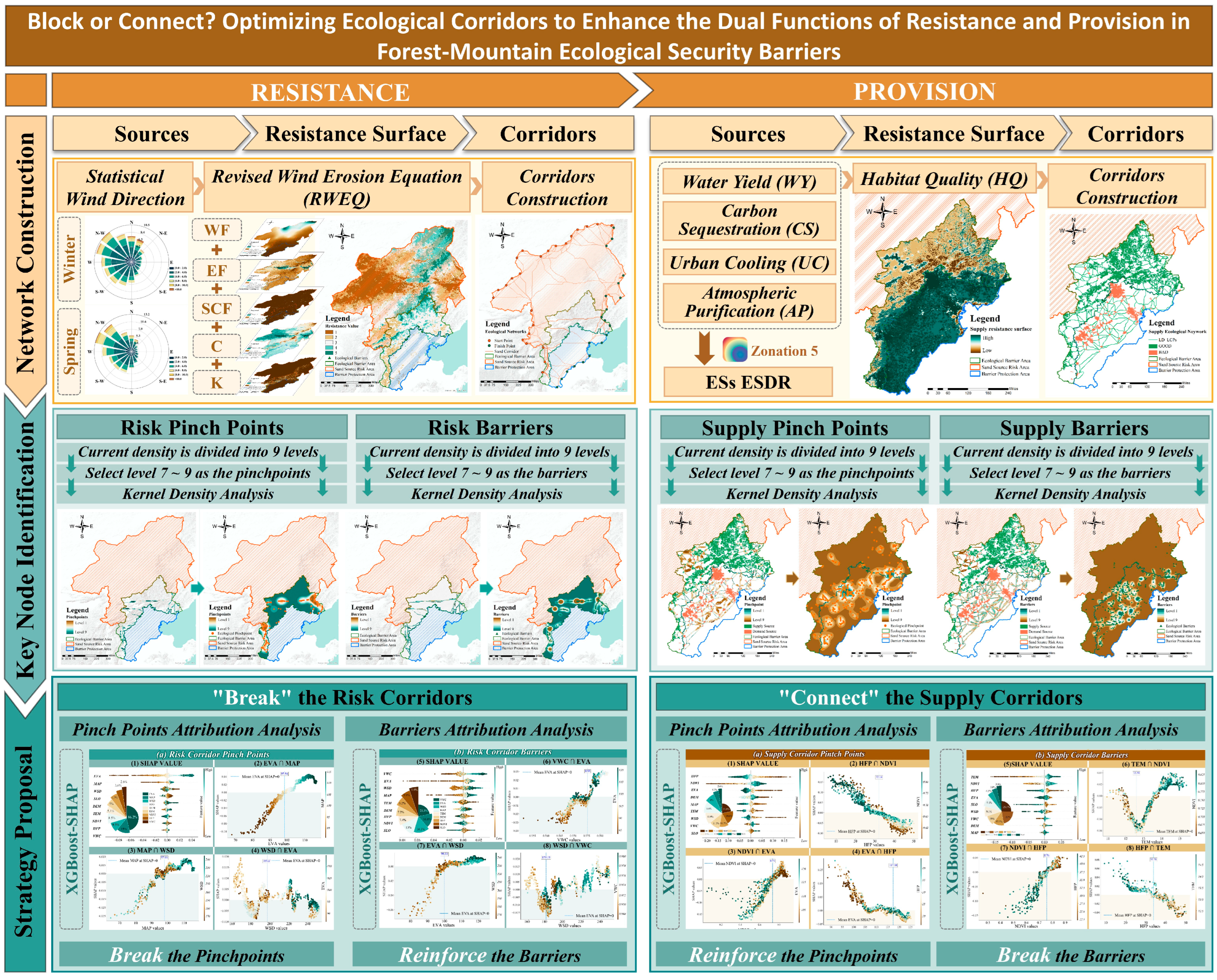 Ecological security barriers safeguard regional ecological security by blocking external risks and supplying internal services. However, existing research has primarily focused on optimizing the connectivity and protection of internal ecological patches within barriers. At a broader scale, there remains insufficient attention on coordinating the “blocking of external ecological risk corridors” and “connecting corridors that supply ecosystem services to internal urban areas”. To address this, this study develops a framework for constructing ecological corridors that integrates both reverse (resistance) and forward (provision) perspectives. Taking the Yanshan–Taihang Mountain Ecological Barrier as a case study, circuit theory is applied to identify risk corridors traversing the barrier area. Service supply corridors directed toward internal urban areas are also established, and key nodes along these corridors are identified. Furthermore, the XGBoost-SHAP method is employed to quantitatively analyze the influencing factors and mechanisms of these key nodes. Finally, strategies are proposed to block risk corridors and connect supply corridors. The main results are as follows: (1) A total of 29 risk corridors, 158 risk pinch points, and 210 risk barriers were identified, along with 250 supply corridors, 158 supply pinch points, and 118 supply barriers, revealing the distinct distribution patterns of both risk transmission and service supply corridors. (2) The dominant factors influencing different types of corridors exhibited significant differences: risk corridors were primarily regulated by natural factors such as mean annual evapotranspiration (EVA) and soil volumetric water content (VWC), whereas supply corridors were mainly influenced by human activities, including the human footprint index (HFP) and land surface temperature (TEM). (3) Even within the same type of corridor, the dominant factors and their operating mechanisms—such as threshold effects and nonlinear interactions—showed considerable heterogeneity across nodes of different characteristics. Based on these findings, differentiated policy recommendations were proposed. This study aims to synergistically enhance the bidirectional functionality of forest-mountain ecological barriers by disrupting external risk corridors and reconstructing internal supply networks. The framework and methodology presented here can provide theoretical and empirical references for the planning and management of other similar barrier regions.