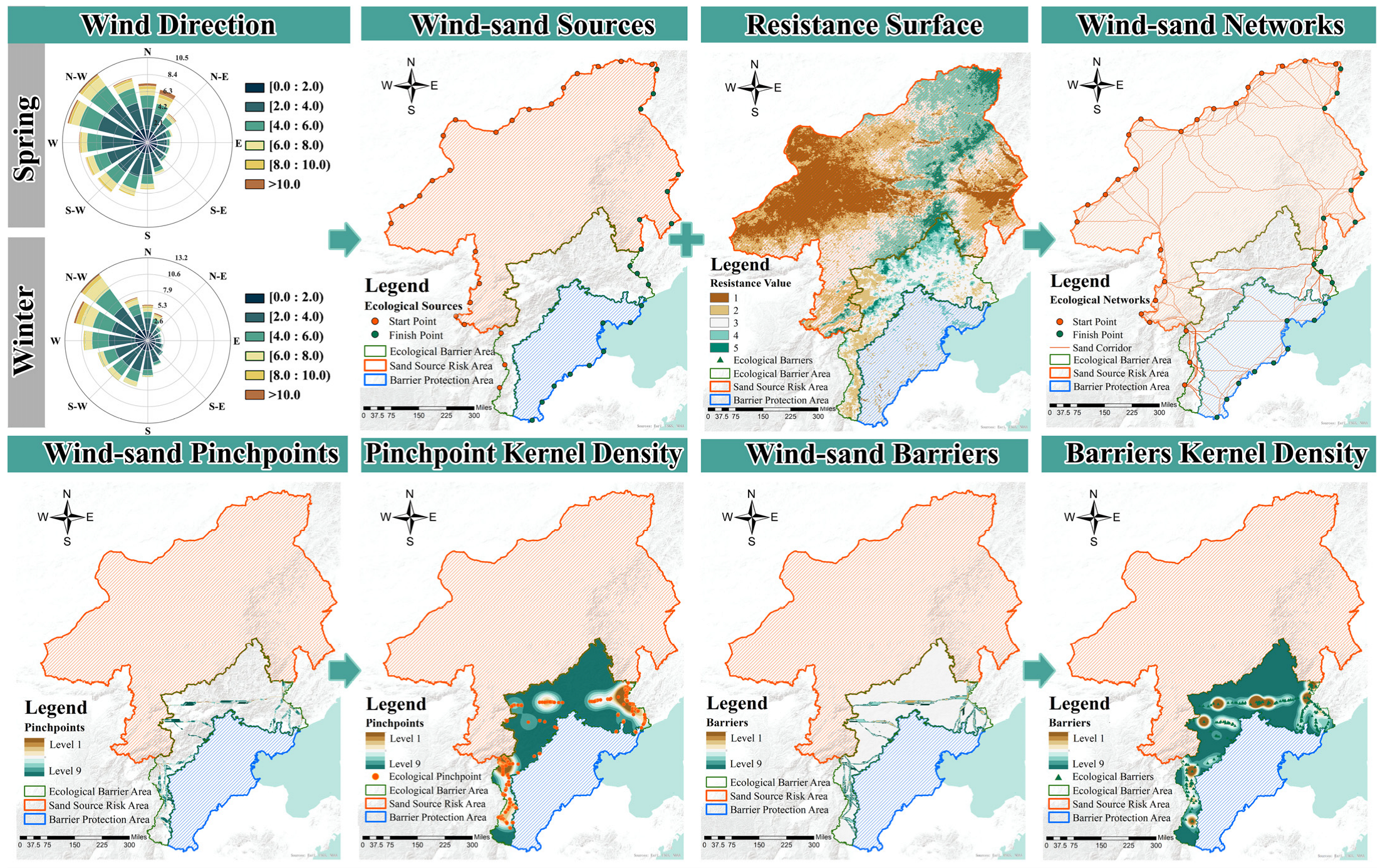 To achieve the “Resilience” function, this study first determined the dominant wind directions from January to March (the frequent sandstorm season) based on meteorological data. The soil wind erosion intensity was then calculated using the Revised Wind Erosion Equation to construct a resistance surface. Based on circuit theory, potential sand transport corridors were identified, and pinch points and barriers were classified according to current density levels. Subsequently, the XGBoost-SHAP method was employed to quantitatively analyze the driving factors and their mechanisms influencing these critical nodes. This provides a scientific basis for formulating targeted measures to “break ecological pinch points and consolidate barriers”.