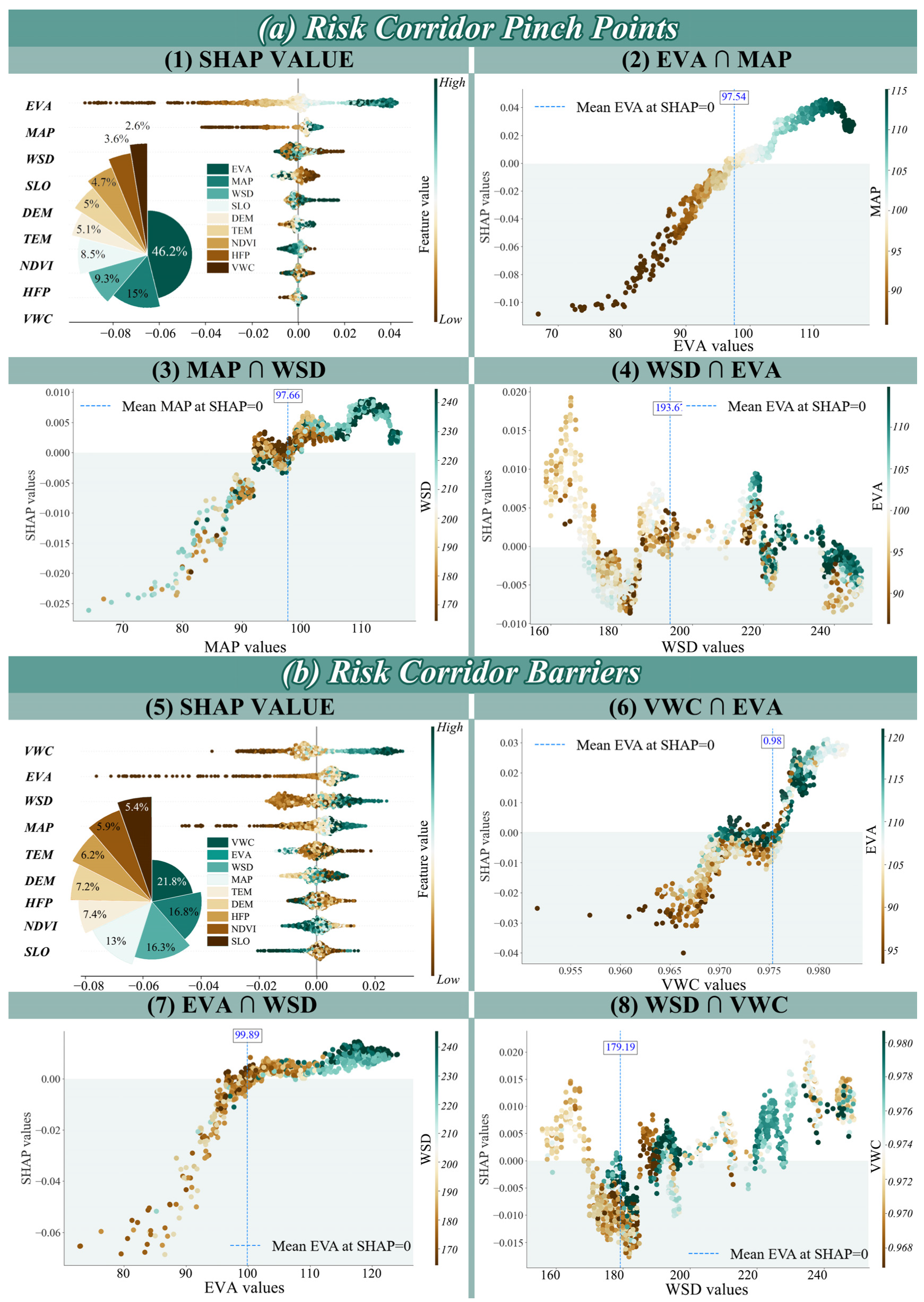 For risk corridor pinch points, EVA is the most critical factor (SHAP value = 0.0116) and exhibits a significant positive synergistic relationship with MAP (Figure 5(2)). In regions with abundant precipitation, increased WSD significantly enhances windbreak and sand fixation effects. Precipitation not only directly affects VWC and soil particle cohesion but also influences vegetation growth, thereby regulating wind erosion. When MAP < 97.66 mm, windbreak and sand fixation capacity decline significantly with increasing WSD. When MAP ≥ 97.66 mm, the SHAP value shifts from negative to positive within the same WSD range, indicating that precipitation compensation enhances corridor resistance (Figure 5(3)). Wind acts as a primary climatic driver of wind erosion. WSD exhibits complex interactions with EVA; beyond WSD exceeding 199.67 m/s, increased EVA positively contributes to transmission resistance within the same WSD range. This suggests that higher EVA can effectively buffer wind erosion by regulating surface VWC conditions (Figure 5(4)).
