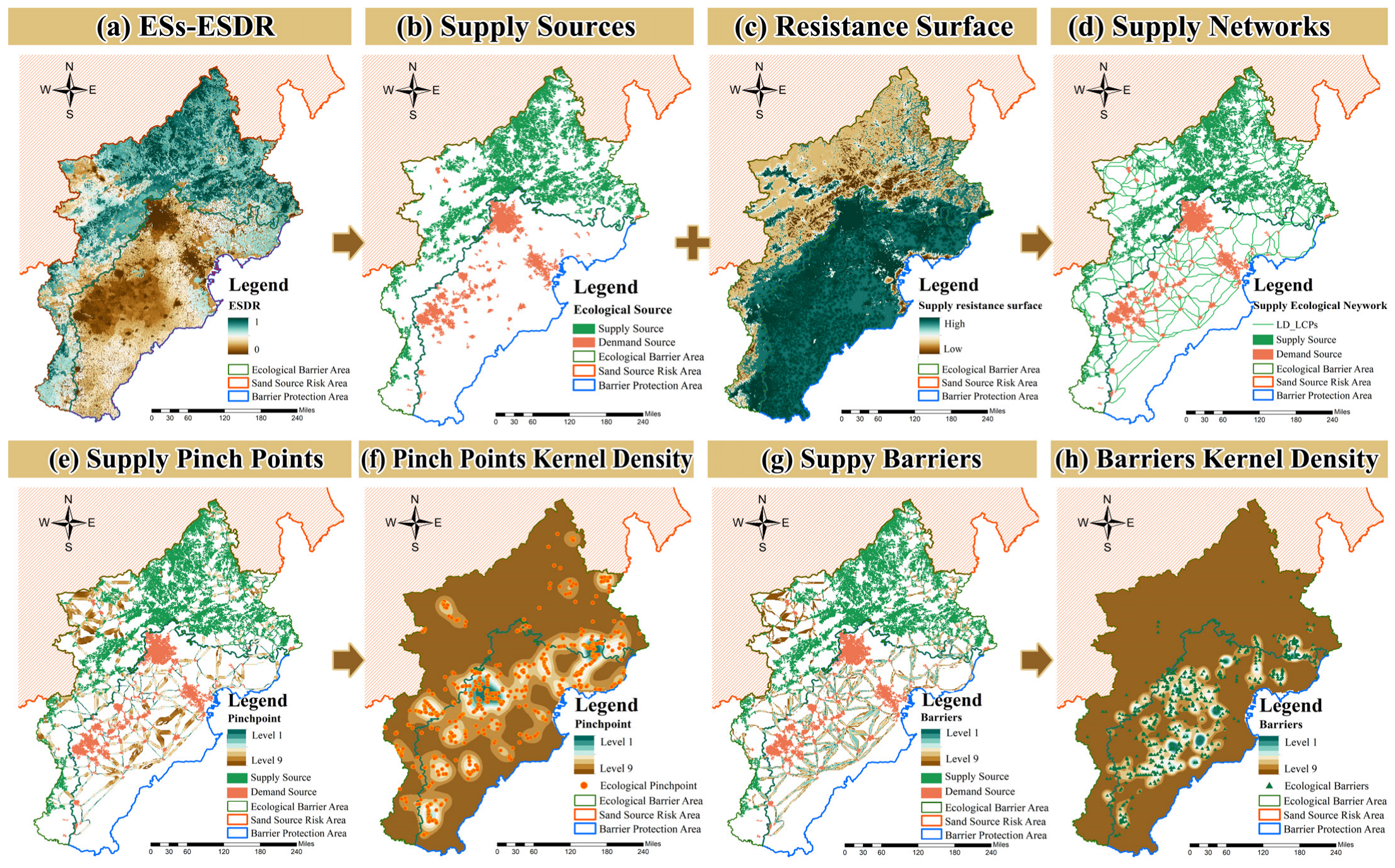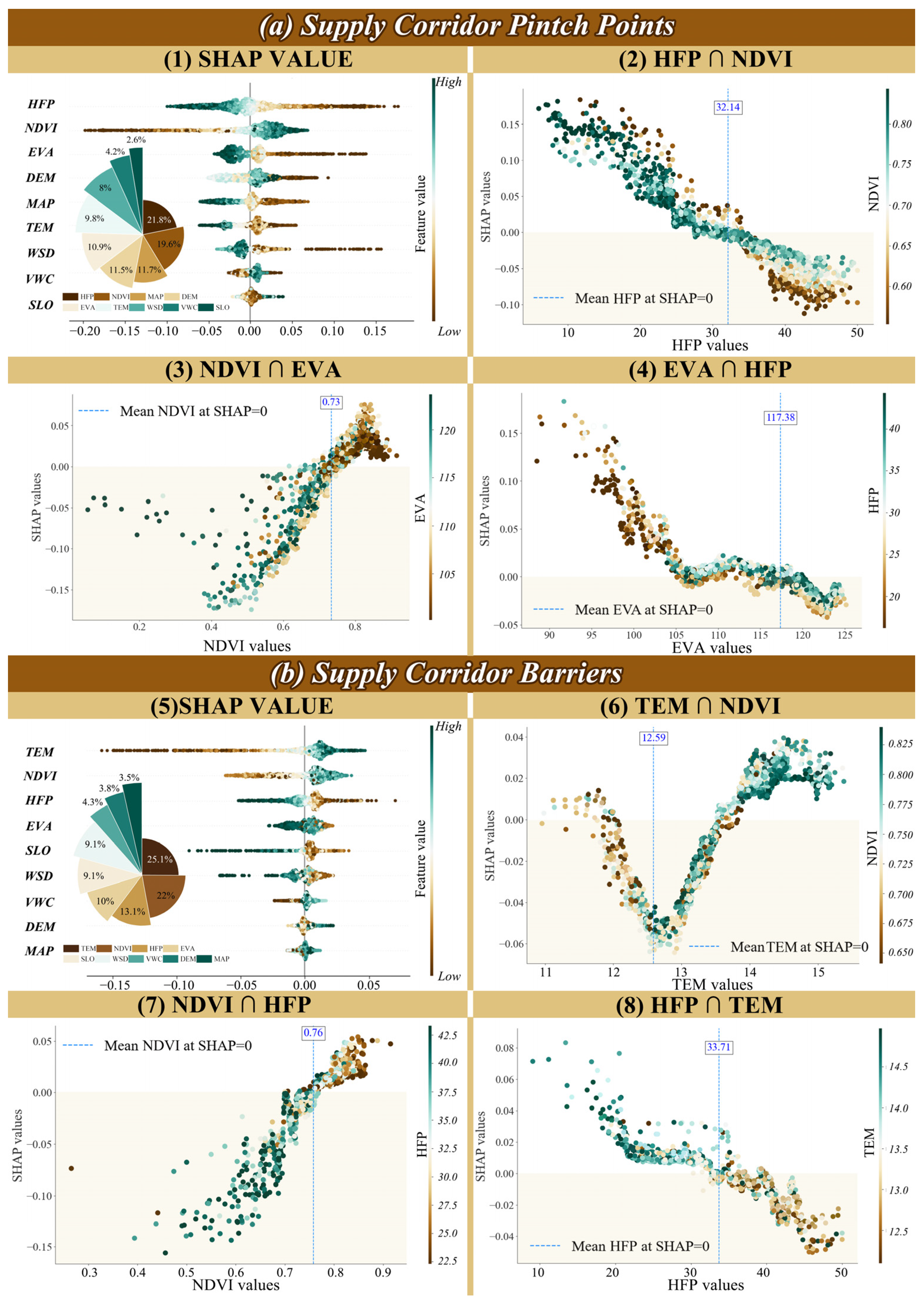 To achieve the “provision” function, this study first comprehensively assessed the supply and demand of four key ecosystem services to identify integrated supply sources and demand areas. Habitat quality was utilized as the resistance surface for the supply services to model supply corridors. Subsequently, the XGBoost-SHAP method was applied to analyze the formation mechanisms of supply pinch points and barriers. This analysis provides a scientific basis for formulating targeted measures to “consolidate ecological pinch points and eliminate barriers”.