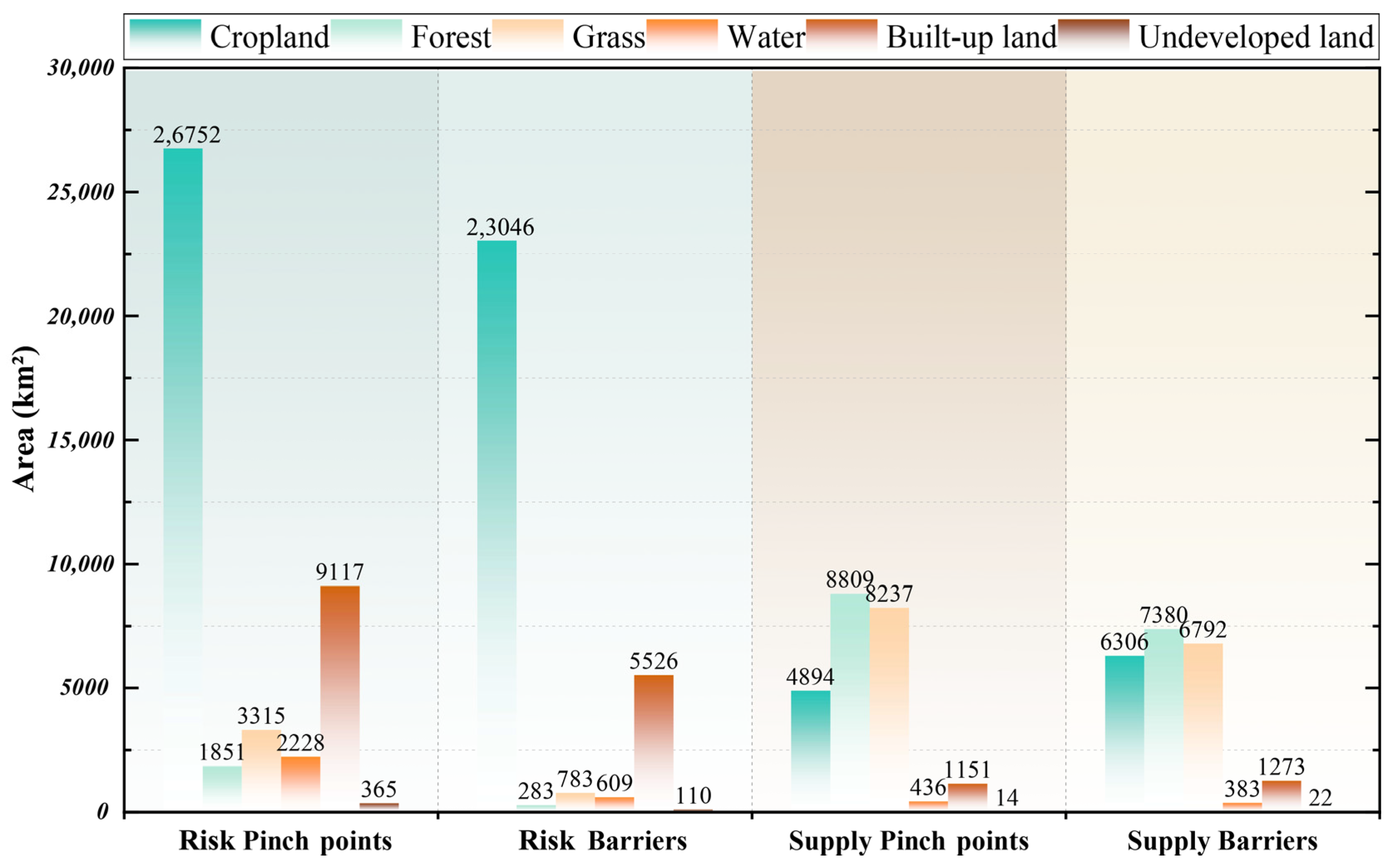 As shown in Figure 7a, the study identified 108 supply areas covering 18,454 km2 and 68 demand areas covering the same total area. A total of 259 corridors were delineated, with a combined length of 9606 km. Within these corridors, 101 supply pinch points were identified, covering 974 km2, primarily located in Baoding, Tangshan, and other regions. These areas represent key industrial, energy, and densely populated zones in the Beijing–Tianjin–Hebei region, where high-intensity urbanization and industrialization have created ecological demands that far exceed supply capacity, resulting in supply-demand imbalance pinch points. Additionally, 263 supply barriers were identified, covering 5471 km2 (Figure 7b). These barriers are mainly concentrated in Baoding and Hengshui, where the ecological baseline is relatively fragile and has long been affected by water scarcity, soil degradation, and environmental pollution. The combined effects of the Huangjing Five-Day Index and population pressure have led to significant declines in ecosystem service functions, making these areas critical hotspots for barriers.