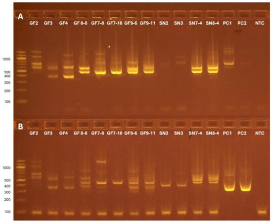 Gel electrophoresis results for the products of the ITS1–ITS4 (A) and CF01–CF02-TS (B) PCR amplifications on a subset of the samples. (A) ITS1–ITS4 amplification shows a range of typical product sizes [15], with the most abundant products in the 400–700 base pair (bp) range. (B) CF01–CF02-TS amplification of the positive control is indicated by a bright band in the PC1 and PC2 lanes at the expected size of 347 bp (280 bp + 67 bp for TruSeq adapters) [3]. The presence of new bands in the 300–400 bp range in several surveillance samples indicates new nested products amplified by CF01–CF02-TS. (A,B) PC1 is a 1:10 dilution of B. fagacearum DNA, while PC2 is a 1:100 dilution. A no-template control is shown as NTC.