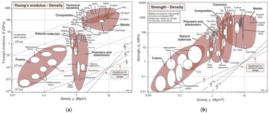 Ashby-graphics; (a) strength/density; (b) Young’s modulus/density.