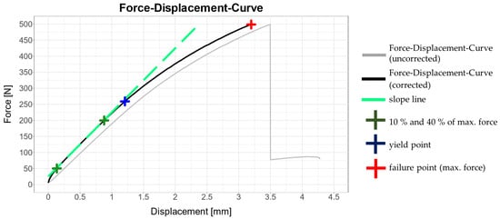 Figure 3 presents an example of a force–displacement curve obtained from a representative specimen. The grey curve represents the uncorrected measurement, which includes all deformation components originating from the testing setup and specimen contact. The black curve depicts the corrected force–displacement relationship after the removal of undesired deformation contributions. Based on the corrected force–displacement data, the stress parameters and the global modulus of elasticity were determined. First, the maximum test force corresponding to the failure point was identified. In Figure 3, this failure point is indicated by a red cross. Subsequently, the global modulus of elasticity was calculated in accordance with EN 789 by applying linear regression to all data points within the interval between 10% and 40% of the ultimate load (dark green crosses in Figure 3). The slope of this linear segment was then converted into the modulus of elasticity (green line in Figure 3) [38]. Finally, the proportional limit was determined, representing the transition from linear to nonlinear behavior. This point is defined as the first location along the curve where the local tangent modulus falls below 95% of the slope of the initial linear region. The stress corresponding to this point is defined as the maximum permissible stress and is marked in Figure 3 by a blue cross. Conversion of the measured forces into stress values was performed using the standard equations for calculating bending stress under three-point bending conditions (Equations (A5) and (A6) in the Appendix A).