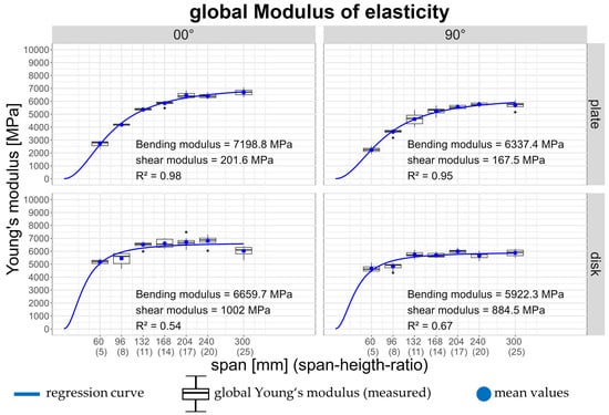 According to Timoshenko beam theory, the total deformation in three-point bending is composed of a bending and a shear component [35]. These components can be considered independently of one another. The mathematical formulation of this relationship is given in Equation (A1) (Appendix A). Accordingly, the bending deformation depends on the bending modulus, while the shear deformation depends on the shear modulus (see Appendix A, Equations (A2) and (A3)). By substituting the differential equations for bending and shear under the load case of three-point bending with a central point load, a fundamental expression for the global modulus of elasticity can be derived as a function of the bending modulus, the shear modulus, the span length, and the cross-sectional parameters (area and moment of inertia), as shown in Equation (1). If the cross-sectional geometry is known, the equations for the cross-sectional area and moment of inertia can be inserted, simplifying the expression. Regardless of the cross-sectional shape, the specimen width cancels out, leaving only the span and specimen height as relevant geometric parameters. Consequently, Equation (1) reflects the dependency of the global modulus of elasticity on the span-to-depth ratio. When global moduli of elasticity are known for different span-to-depth ratios, the bending modulus and shear modulus of the material can be determined by applying nonlinear regression to the experimental data.