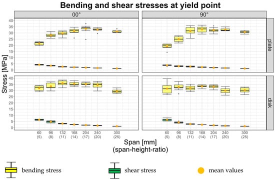 Figure 6 presents the bending and shear stresses at the proportionality limit for all tested configurations. The stresses were calculated according to the equations provided in Equations (A5) (bending) and (A6) (shear). For plate loading, the determined bending stresses are initially low at small span-to-depth ratios and tend to increase with increasing ratios. Similar to the behavior observed for the modulus of elasticity, the stress levels approach an asymptotic limit, which can be defined as the bending strength for the respective configuration. The opposite trend is observed for the shear stresses: these are highest at the smallest tested span-to-depth ratio and decrease as the ratio increases. This behavior indicates that at small span-to-depth ratios, shear deformation has a greater influence on failure. This is evident from the fact that the achieved bending stresses are lower than those observed at larger spans, such as those typically prescribed in standardized test methods. Due to the abrupt failure behavior of the specimens, it cannot be clearly determined whether pure shear or pure bending failure occurred. However, the results suggest that shear failure in the cross layers predominates at small span-to-depth ratios, while at larger ratios, bending failure in the outer tension layers is more likely. For both panel configurations, the measured bending stresses remain approximately constant across all span-to-depth ratios. The shear stresses, similar to the plate configuration, are highest at the smallest ratio. No significant differences between the 00° and 90° configurations were observed for either plate or panel loading. The mean values and standard deviations of the key parameters for all configurations are summarized in Table A2 in Appendix A.