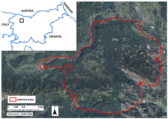 The study area is the Alpine karst plateau of Jelovica, located in the northwestern part of Slovenia (Figure 1). It is almost entirely forested. The terrain includes heterogeneous steep slopes on the plateau’s edges (elevation ranging from 500 to 1000 m), a broad central section of relatively level terrain at elevations between 1000 and 1400 m, and a smaller southeastern section with varied slopes that increase in steepness toward the Ratitovec massif. Forests cover 15,868 ha, representing 88% of the entire area, while forest cover on the plateau itself reaches as high as 95%.