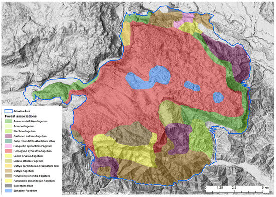 The dominant forest association on the Jelovica plateau is Homogyno sylvestris–Fagetum, which occupies 46% of the study area (Figure 2) [51]. This association represents zonal forests of the montane belt in the pre-Alpine phytogeographical region [52]. It occurs at elevations between 900 and 1400 m, and in shady (north-facing) locations can descend as low as 600 m. The dominant tree species in this association are European beech and silver fir, with their relative proportions shaped by forest management practices. Norway spruce is naturally present in small amounts. However, pure spruce stands have also been established on these sites, and they are now characteristic of the Jelovica plateau. Other types of beech forest associations cover an additional 46% of the study area. The only spruce-dominated forest association in the study area is Sphagno-Piceetum, which covers just 3% of the forested area. Historically, beech forests were predominant on Jelovica, but they were extensively cleared for charcoal production and ironworking [53] and gradually replaced by predominantly spruce forests. Today, forest stands across nearly the entire plateau are heavily dominated by Norway spruce [47,54].