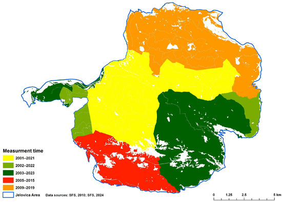 We analysed stand maps from 2009 (first period) [57] and 2023 (second period) [58]. Since the Slovenia Forest Service (SFS) renews forest management plans for forest management units (FMUs) on a ten-year cycle, and the study area spans six FMUs, we included data from 2001, 2002, 2003, 2005, and 2009 in the first period, and data from 2015, 2019, 2021, 2022, and 2023 in the second period (Figure 3).