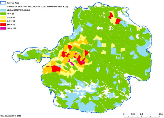 Between 2018 and 2023, sanitary felling accounted for more than 20% of the growing stock on 14% of the forested area in the Jelovica area. More than 60% of all sanitary felling by timber volume was carried out on just 3% of the forested area. On 15% of the forest area, no sanitary felling occurred. The highest concentration of sanitary felling was in the western part of the area—on the plateau of Jelovica—where logging activity was also spatially aggregated (Figure 4). The main causes of sanitary felling were bark beetle infestations, windthrow, and snow damage.