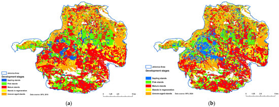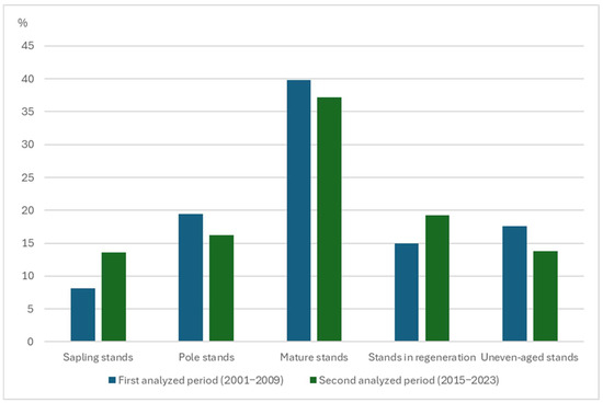 The distribution of stand development phases differed significantly between the two analysed periods (2001–2009 vs. 2015–2023; p < 0.001), indicating a structural shift of development phases (Figure 5 and Figure 6). In both the first and second analysis periods, mature stands were the predominant developmental phase across Jelovica. Nevertheless, their share of the total forest area declined slightly, from 40% to 37%. The shares of uneven-aged stands and pole-stage stands also decreased, while the shares of saplings stands increased from 8% to 14%, and regenerating stands from 15% to 17%. The share of saplings stands increased in a spatially aggregated pattern in the same area where extensive sanitary felling was carried out (the northwestern part of the Jelovica plateau). This led to the formation of larger, contiguous areas of saplings stands.