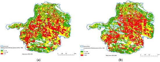 Norway spruce growing stock classes by stand, based on datasets from 2001–2009 (a) and 2015–2023 (b).
