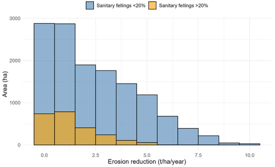 Distribution of soil erosion in areas where more than 20% of sanitary felling was carried out and in areas where no sanitary felling occurred or where it affected less than 20% of the growing stock.