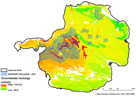 The distribution of ES values for water flow regulation across the entire study area is positively skewed (Figure 10 and Figure 11), meaning that a relatively large proportion of the area shows lower availability of this ES. This is primarily due to the high proportion of mature forests, which retain a substantial share of precipitation in their canopies, where it subsequently evaporates and does not infiltrate into the soil. Areas with high availability of this ES are primarily located in the far western and central-western parts of the Jelovica plateau. The average value of groundwater recharge for the entire study area is 550.5 mm per year. In areas where sanitary felling exceeded 20% of the growing stock, the groundwater recharge value is 681.8 mm per year, which is statistically significantly higher (p < 0.001) than in areas where sanitary felling was not conducted or where it accounted for less than 20% of the growing stock (527.6 mm per year).
