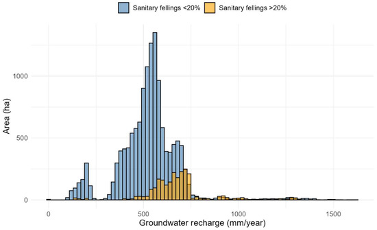 Distribution of groundwater recharge in areas where more than 20% of sanitary felling was carried out and in areas where no sanitary felling occurred or where it affected less than 20% of the growing stock.