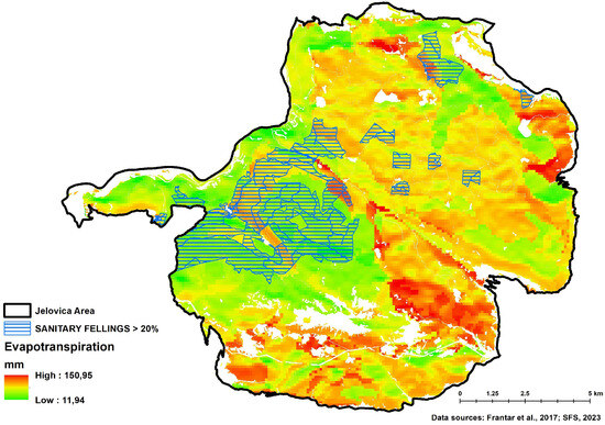 The availability of the ES related to regional climate regulation was assessed using the indicator of actual evapotranspiration. The distribution of evapotranspiration values across the entire study area reveals two distinct peaks: one around 70 mm (representing 14% of the total area) and another around 100 mm (representing 37% of the area) (Figure 12 and Figure 13). The spatial distribution of areas with varying evapotranspiration values shows that zones with high evapotranspiration are concentrated in the southern part of the study area, and to a lesser extent in the northern, northeastern, and central parts. The average evapotranspiration value across the entire analysed area is 90.3 mm. In areas where more than 20% of the growing stock was affected by sanitary felling, the average evapotranspiration value is 79.6 mm, which is statistically significantly lower (p < 0.001) than in areas where no sanitary felling was conducted or where it accounted for less than 20% of the growing stock (92.2 mm).