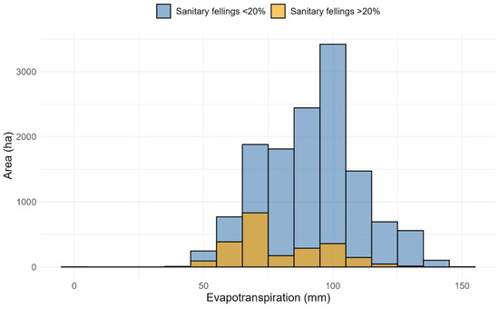 Distribution of evapotranspiration in areas where more than 20% of sanitary felling was carried out and in areas where no sanitary felling was carried out or was less than 20% of the growing stock.