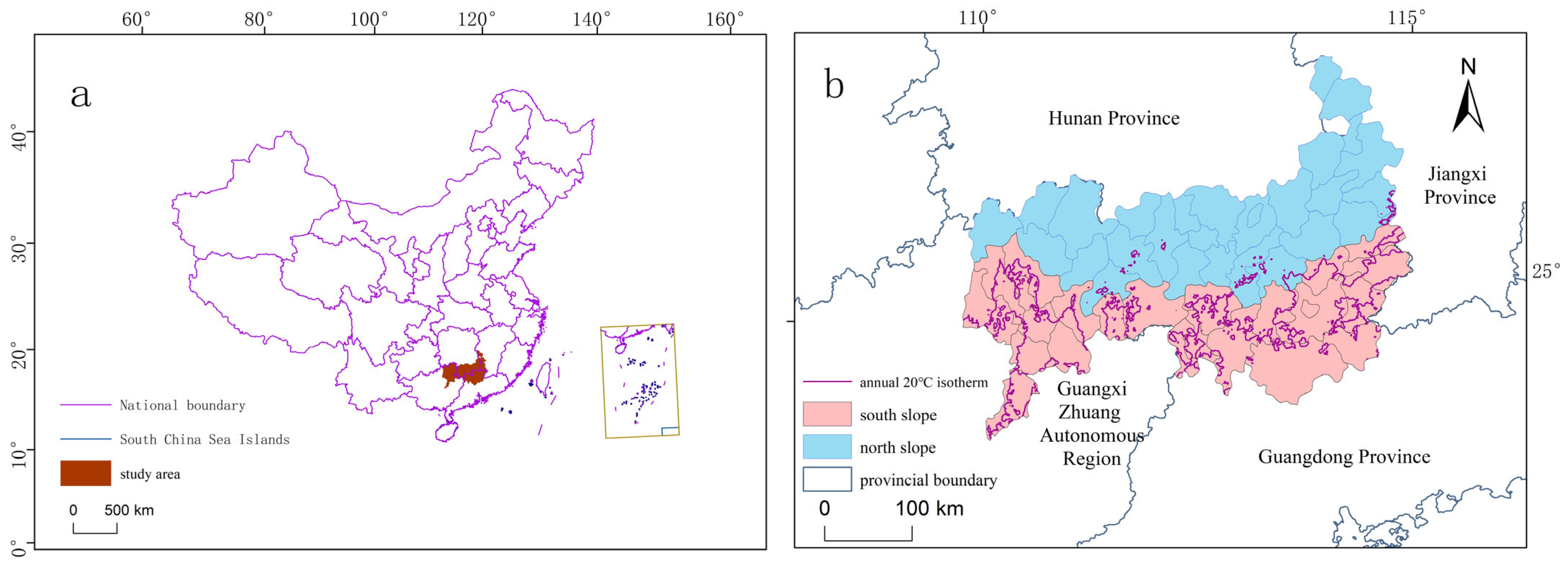 Figure 1. The boundary between the Nanling Mountains’ northern and southern slopes is shown schematically. Note: (a) Overall location of the study area; (b) Division of the study area into northern and southern parts based on the 20 °C annual mean isotherm.
