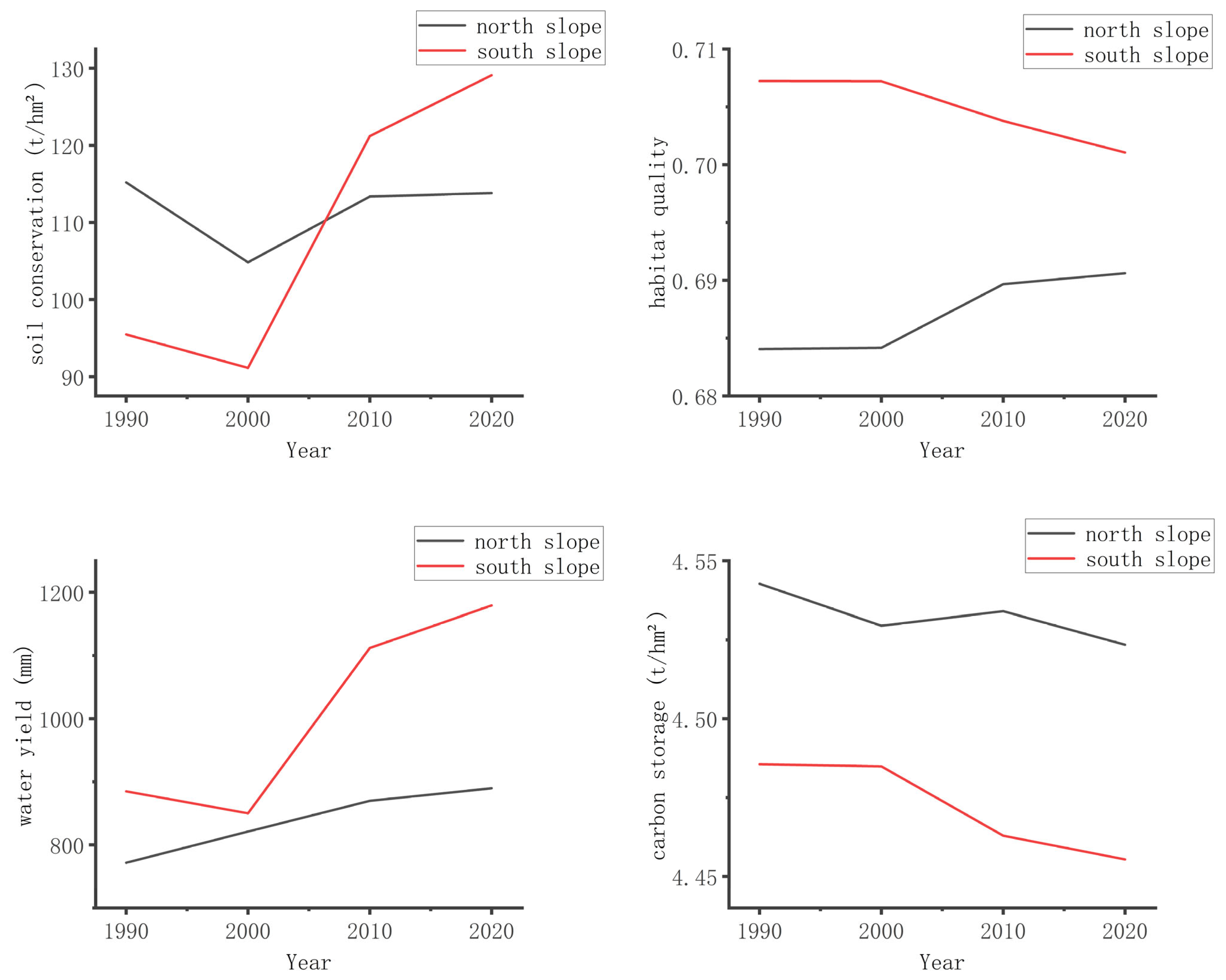 The considerable difference in service between the north and south slopes was further confirmed by the t-test (p < 0.001). Soil retention rates saw a notable reversal, moving from higher retention on northern slopes to southern slopes surpassing northern slopes; HQ disparities increased by 92%; and the slope gradient differential in WY services grew from 113 mm (1990) to 290 mm (2020). Interannual fluctuations are negligible, despite the fact that carbon stocks continue to follow a trend of greater levels in the north and lower levels in the south. According to the statistical findings, slope aspect has a crucial role in controlling the dynamic evolution and regional differentiation of ESs.
