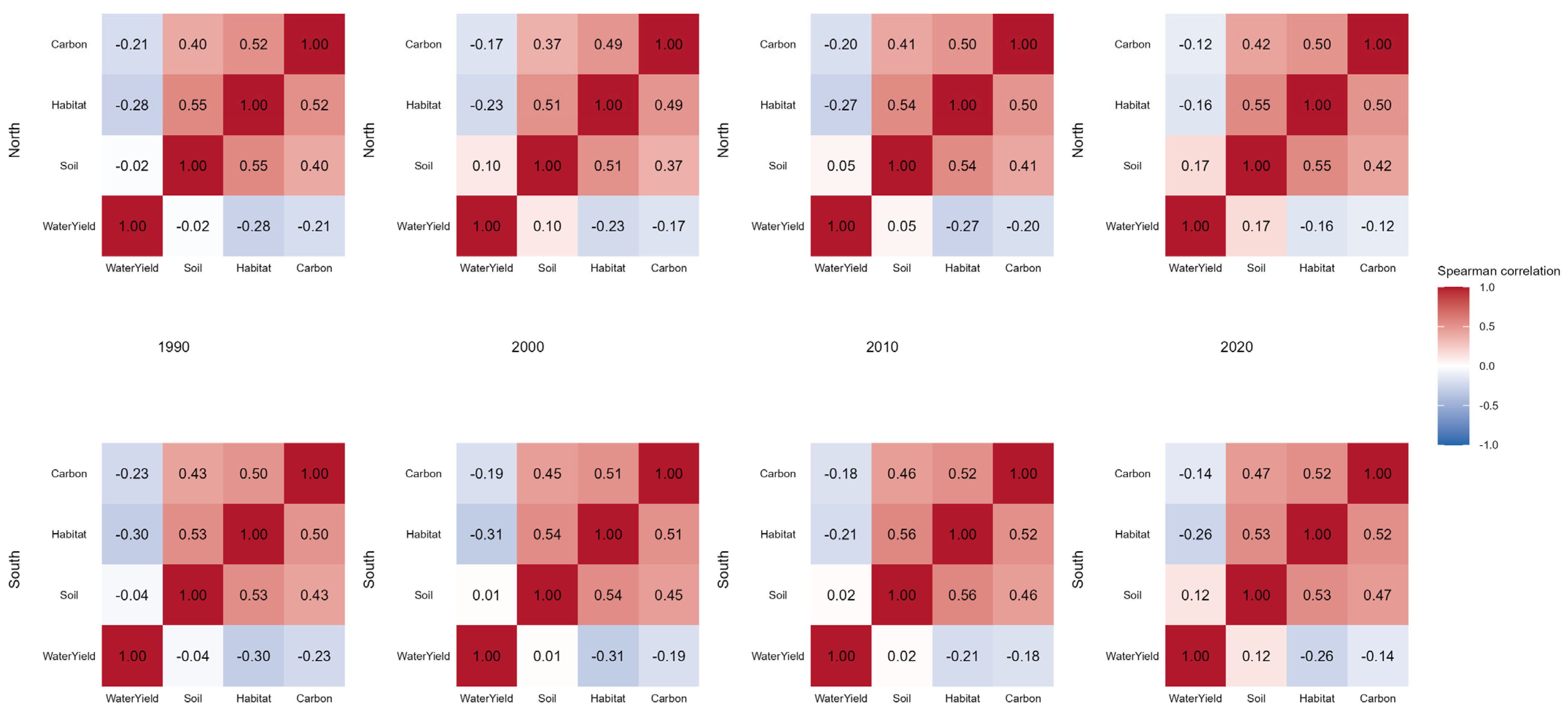 Figure 4. Relationships Among ESs on the Northern and Southern Slopes of the Nanling Mountains. Note: Spearman correlation coefficients between variables are displayed in the heatmap. Colors are clearly mapped to correlation coefficients in the legend on the right: stronger correlations are shown by increased color saturation, while negative correlations are indicated by blue tones and positive correlations by red tones. White denotes no association.