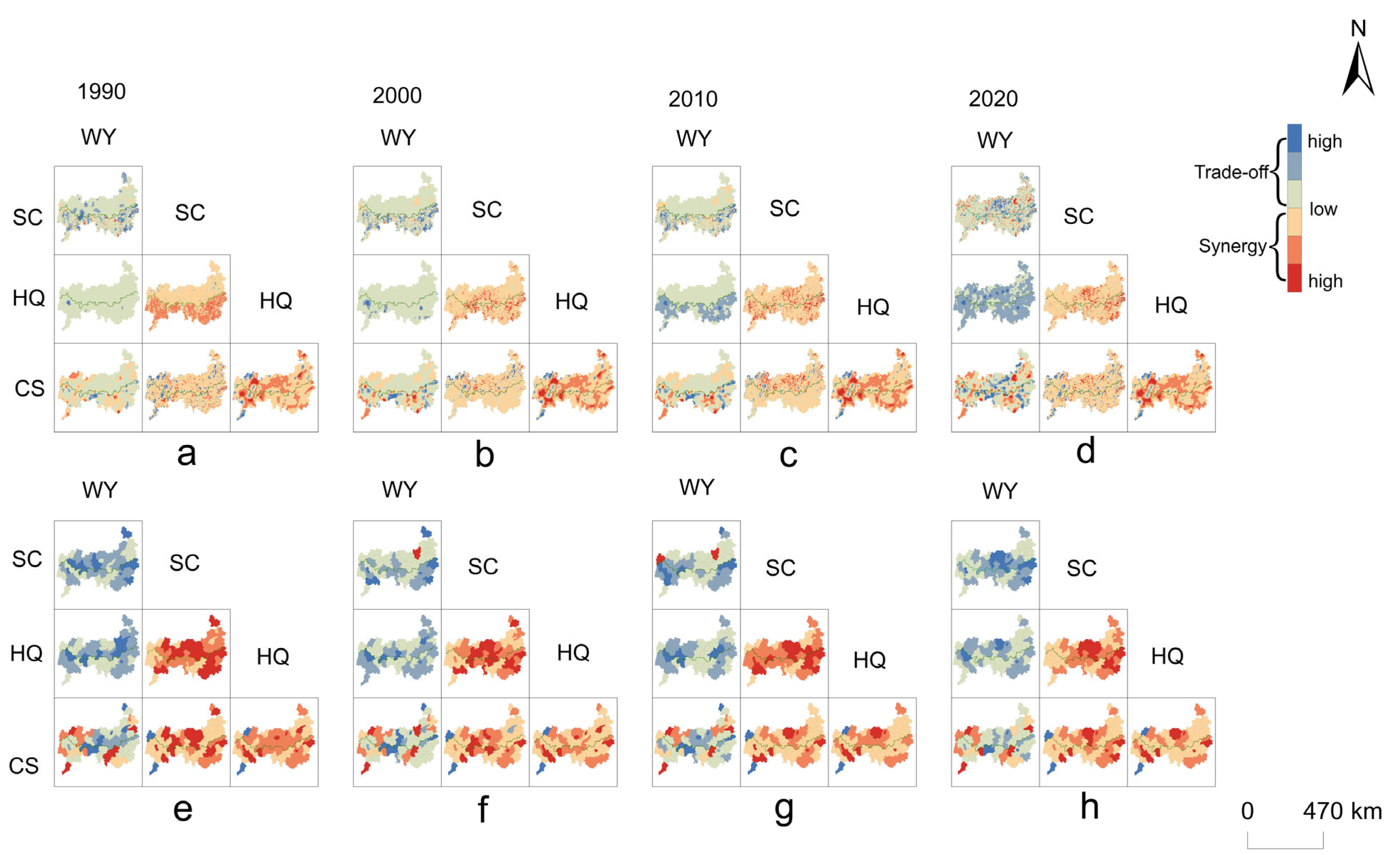Figure 5. Changes in Trade-offs/Synergies Between ESs at Grid and County Scales, 1990–2020. Note: (a) Grid-scale, 1990; (b) Grid-scale, 2000; (c) Grid-scale, 2010; (d) Grid-scale, 2020; (e) County-scale, 1990; (f) County-scale, 2000; (g) County-scale, 2010; (h) County-scale, 2020. The heatmap illustrates trade-offs/synergies among variables. The legend on the right clearly maps colors to trade-off/synergy relationships: blue tones indicate trade-offs, red tones indicate synergies, and higher color saturation signifies stronger trade-offs/synergies.