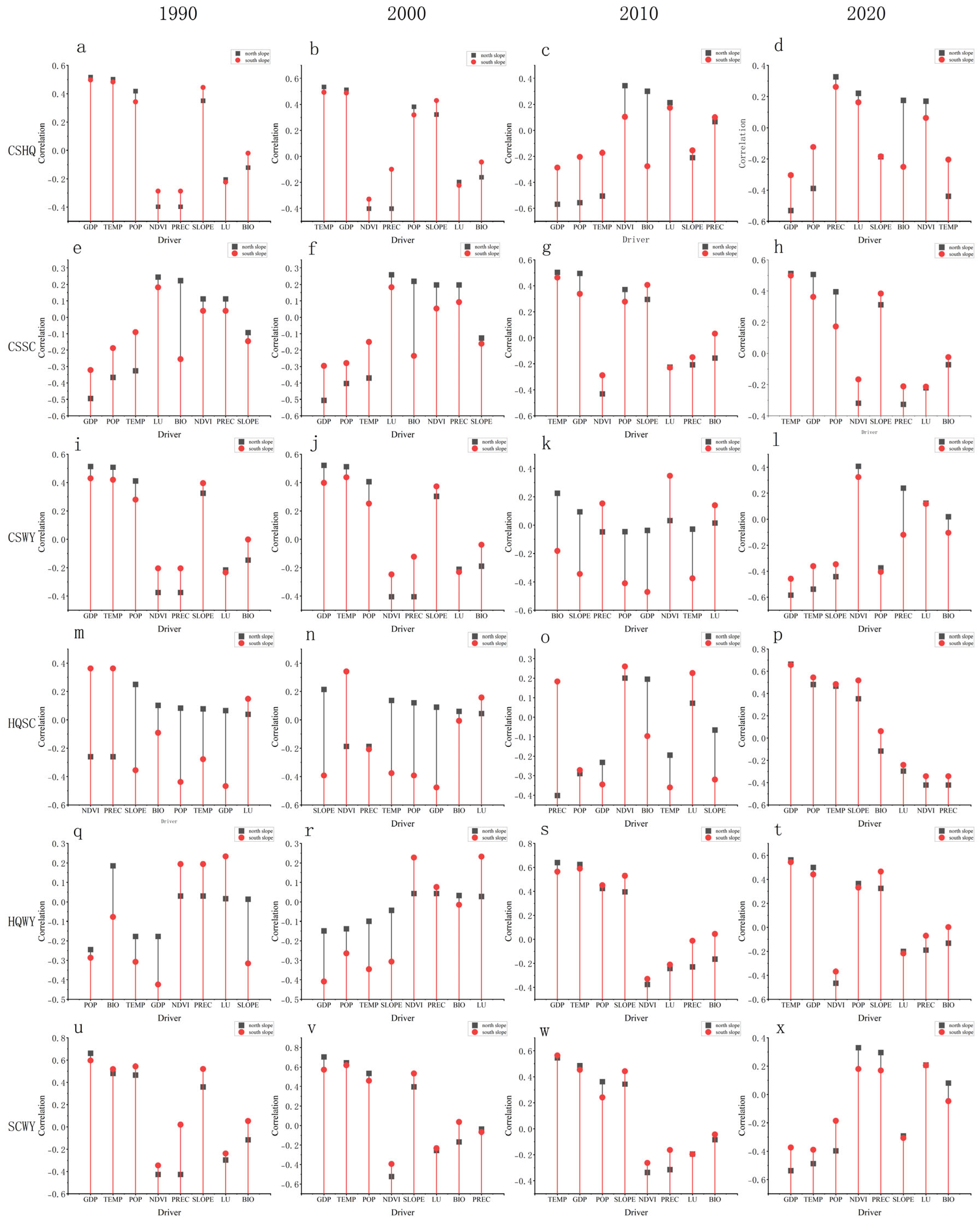The combined impacts of anthropogenic influences and the natural endowment differences between the northern and southern slopes restrict the spatiotemporal variability of ecosystem service trade-offs and synergies in the Nanling area. Figure 6 illustrates how the primary drivers of SC-WY changed across slope aspects between 1990 and 2020. These services were still controlled by temperature (TEMP), GDP, and slope gradient on south-facing slopes. In contrast, north-facing slopes were ruled by GDP and temperature by 2020, as opposed to population (POP) and biodiversity (BIO) in 1990 (see Figure 6u–x). Quality of CS-HQ While GDP remained the primary influencing factor throughout on the northern slope, the driving force on the southern slope changed from early GDP to later temperature domination (see Figure 6a,b). Conservation of CS-SC It shows two drivers of temperature and GDP on the north and south slopes (see Figure 6e–h). Conservation of HQ-SC In the next two decades, temperature became the main factor on both slopes, replacing GDP in 1990 (see Figure 6m–p). HQ-WY on the northern slope evolved from POP and BIO in 1990 to GDP and POP in 2020, while the southern slope has long been controlled by GDP and temperature (Figure 6q–t). The multifaceted connections between terrain, climate, and human activity are the cause of this dynamic shift in trade-off/synergy relationships. Its primary mechanism appears in three ways: First, complicated transformation processes cannot be explained by a single factor; rather, a combination of factors, including temperature, GDP, and slope, must work in concert. Second, spatial heterogeneity in dominant factors—caused by variations in vegetation cover and intensity of human activity between north and south slopes—as well as the long-term impact of GDP on the north slope and the gradual intensification of temperature effects on the south slope led to the emergence of slope-specific differentiation responses. This demonstrates how ESs respond to driving variables in a nonlinear way.
