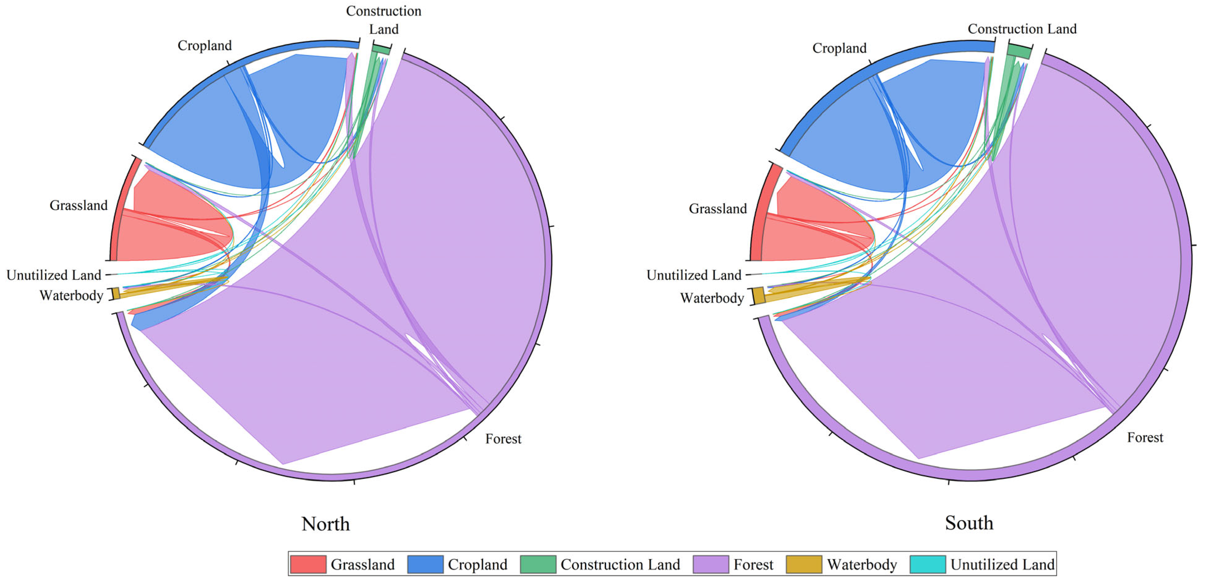Figure 7. Land Use Changes on the Northern and Southern Slopes of the Nanling Mountains, 1990–2020.