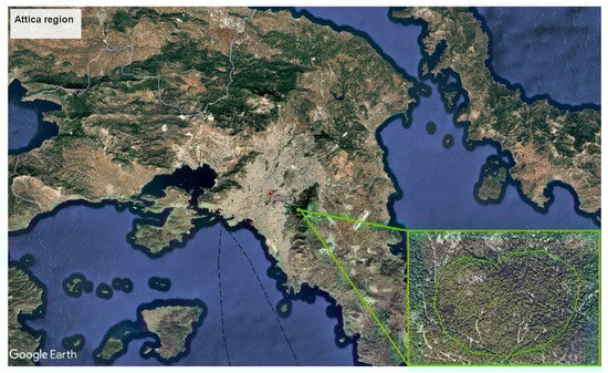 The study was conducted in the Kaisariani Aesthetic Forest, located on the northern foothills of Mount Hymettus (Attica region, Greece) (Figure 1). The site belongs to the Natura 2000 network under the designation “Hymettus Mountain—Kaisariani Aesthetic Forest” (GR3000006) [28]. It was declared an Aesthetic Forest in 1974 (Official Gazette 248/Δ/1974) to safeguard its landscape, biodiversity, and cultural monuments.