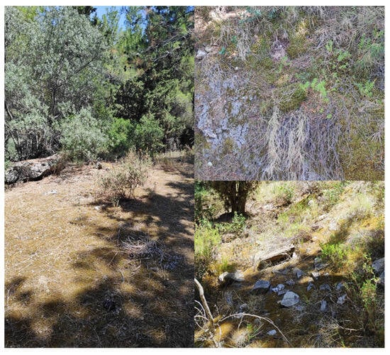 Vegetation is dominated by reforested stands of Aleppo pine, established during the 20th century on degraded land, with scattered P. brutia and C. sempervirens. According to the Habitats Directive (92/43/EEC), the main habitat type is “Mediterranean pine forests with endemic Mesogean pines (code: 9540)”. Despite these reforestations, remnants of evergreen sclerophyllous shrublands consisted of Quercus coccifera L., Arbutus unedo L. (Ericaceae), Phillyrea latifolia L. (Oleaceae), P. lentiscus, and Myrtus communis L. (Myrtaceae) persist, representing the natural vegetation of the area. In lower altitudes, O. europaea and Ceratonia siliqua L. (Fabaceae) are locally present, while riparian zones host Platanus orientalis L. (Platanaceae) and Nerium oleander L. (Apocynaceae) [27].
