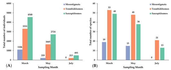 (A) Total abundance and (B) species richness of moss-dwelling mites per order and sampling month.