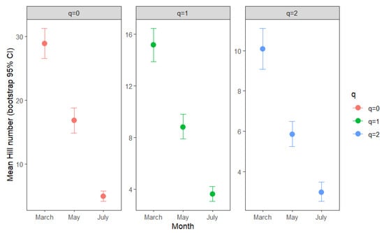 Sample-based estimates of diversity revealed significant (non-overlapping 95% CI) temporal variation. Species richness (q = 0) per sample was highest in March (28.88, 95% CI: 26.52–31.27), intermediate in May (16.84, 95% CI: 14.88–18.80), and lowest in July (4.28, 95% CI: 3.44–5.18). Shannon and Simpson diversity followed similar trends. Shannon (q = 1) estimates: March 15.14, 95% CI: 13.87–16.45; May 8.80, 95% CI: 7.90–9.80; July 3.10, 95% CI: 2.49–9.78. Simpson (q = 2) estimates: March 10.08, 95% CI: 9.07–11.12; May 5.85, 95% CI: 5.25–6.50; July 2.56, 95% CI: 2.06–3.13 (Figure 4).