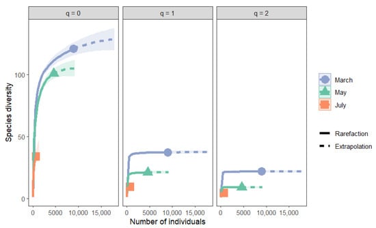 Sample-size-based rarefaction and extrapolation curves for Hill numbers (q = 0, species richness; q = 1, Shannon diversity; q = 2, Simpson diversity) in moss-dwelling mite assemblages collected in March, May, and July. Solid lines represent rarefaction curves, dashed lines indicate extrapolation, and shaded ribbons denote 95% confidence intervals.