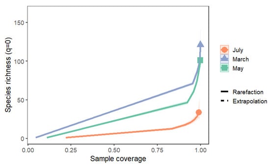 Sample-size-based rarefaction and extrapolation curves (Figure 5) confirmed these patterns. Sampling coverage (Figure 6) was high across all months (March 99.8%, May 99.8%, July 98.9%), indicating that the observed patterns reflect true ecological differences rather than undersampling. Asymptotic estimates of Hill numbers (Table 2) further supported the conclusion that community diversity declined from spring to summer.
