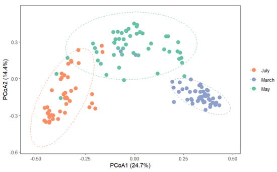 We calculated β-diversity to assess differences in mite community composition among the three sampling months. Abundance data were arranged in a site-by-taxon matrix, with each row representing a sample and each column representing a taxon. The Bray–Curtis dissimilarity index was computed using the vegdist function in the “vegan” package [75]. To statistically test differences in community composition, we used permutational multivariate analysis of variance (PERMANOVA) [76] with 999 permutations, as implemented in the adonis function (“vegan” package). To partition beta diversity into turnover and nestedness components, presence–absence data were analyzed with the “betapart” package using the Jaccard dissimilarity index [77]. Ordination of community dissimilarities was visualized through Principal Coordinates Analysis (PCoA) based on Bray–Curtis distances in the plots generated via “ggplot2” package [78].