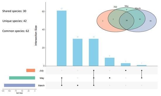 UpSet and Venn diagrams indicated that 30 species were shared across all three months, whereas 30 (March), 9 (May), and 3 (July) species were unique to individual sampling month (Figure 8). The UpSet visualization further highlighted the largest overlaps between March and May.
